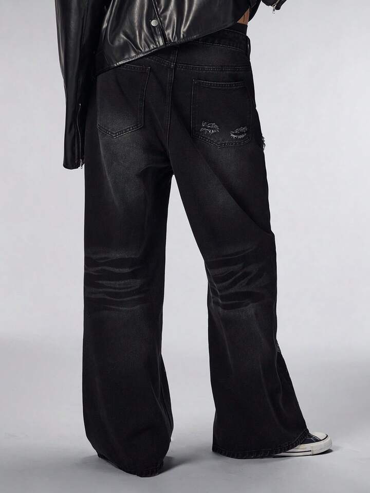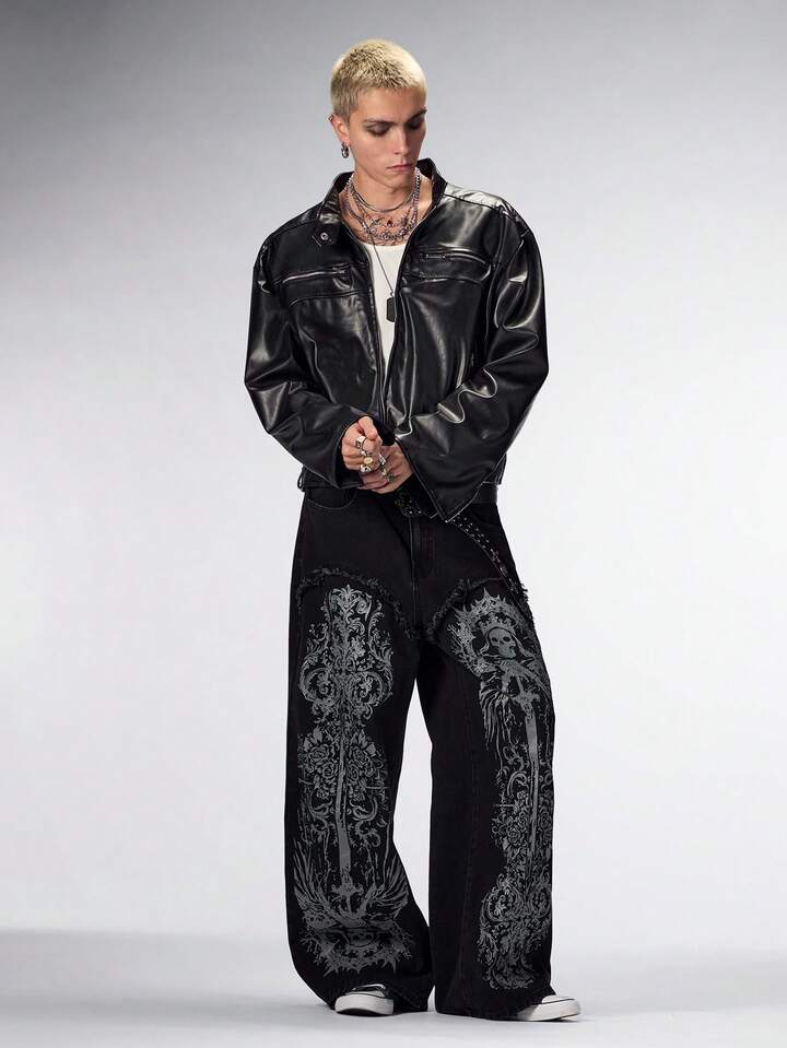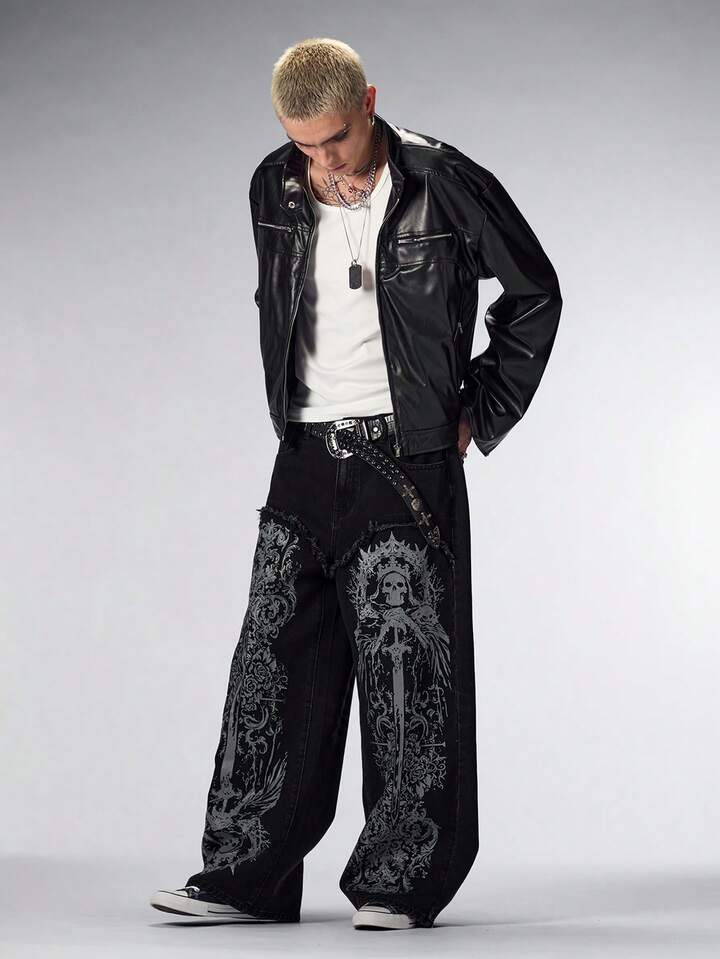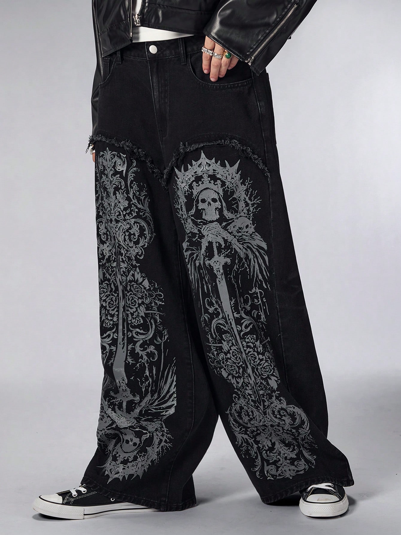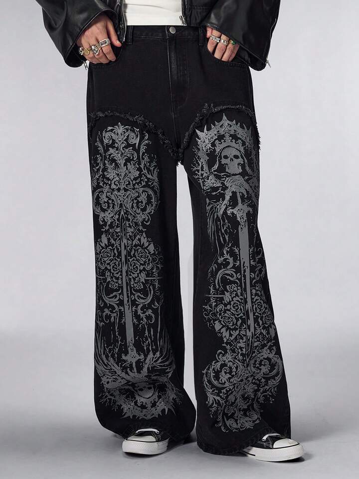 Street Life Jeans rectos casuales con bolsillo e impresión de esqueleto oscuro para hombres