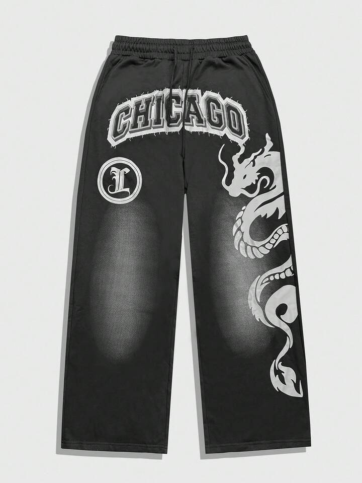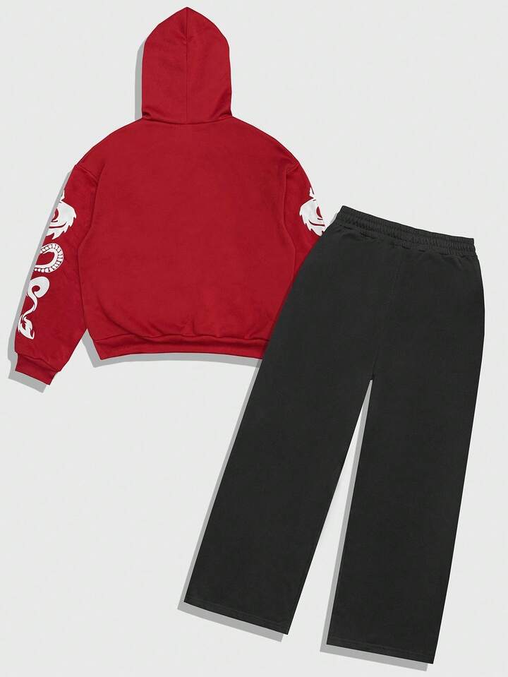 Street Life Conjunto de sudadera con capucha y pantalón de chándal con estampado de dragón y letras para hombre, ropa de otoño