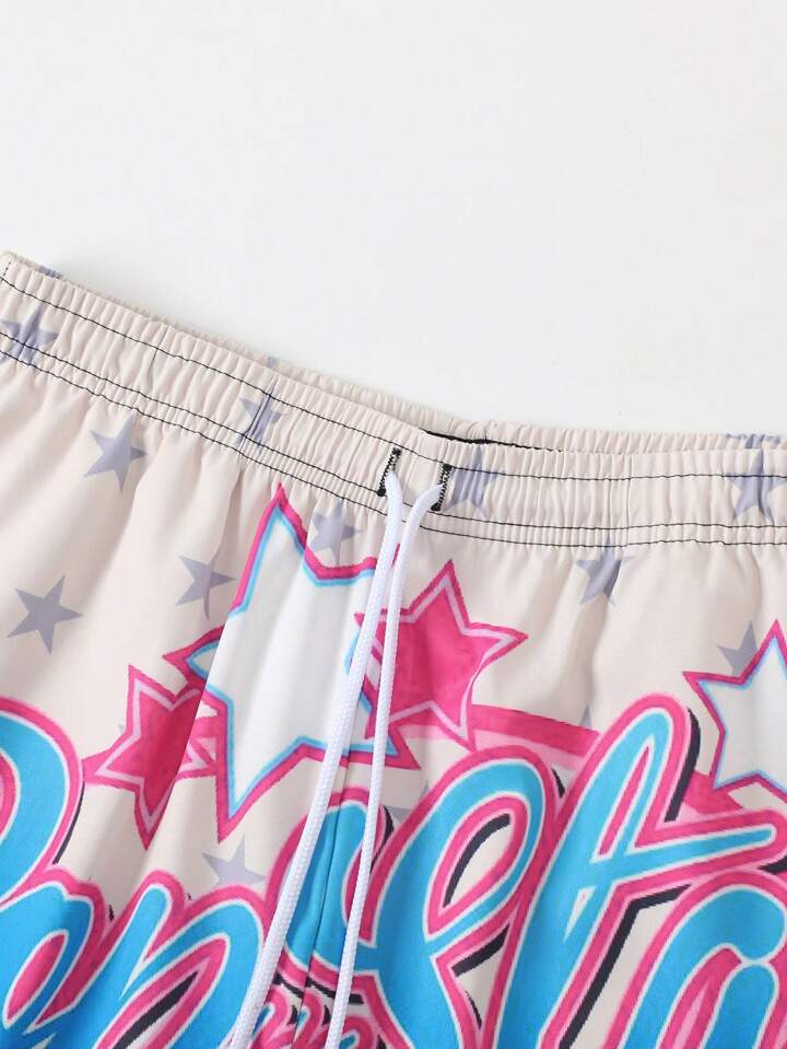 Street Life Pantalones cortos casuales de verano con cintura con cordón, estampado de estrella y letra, para hombres, escuela