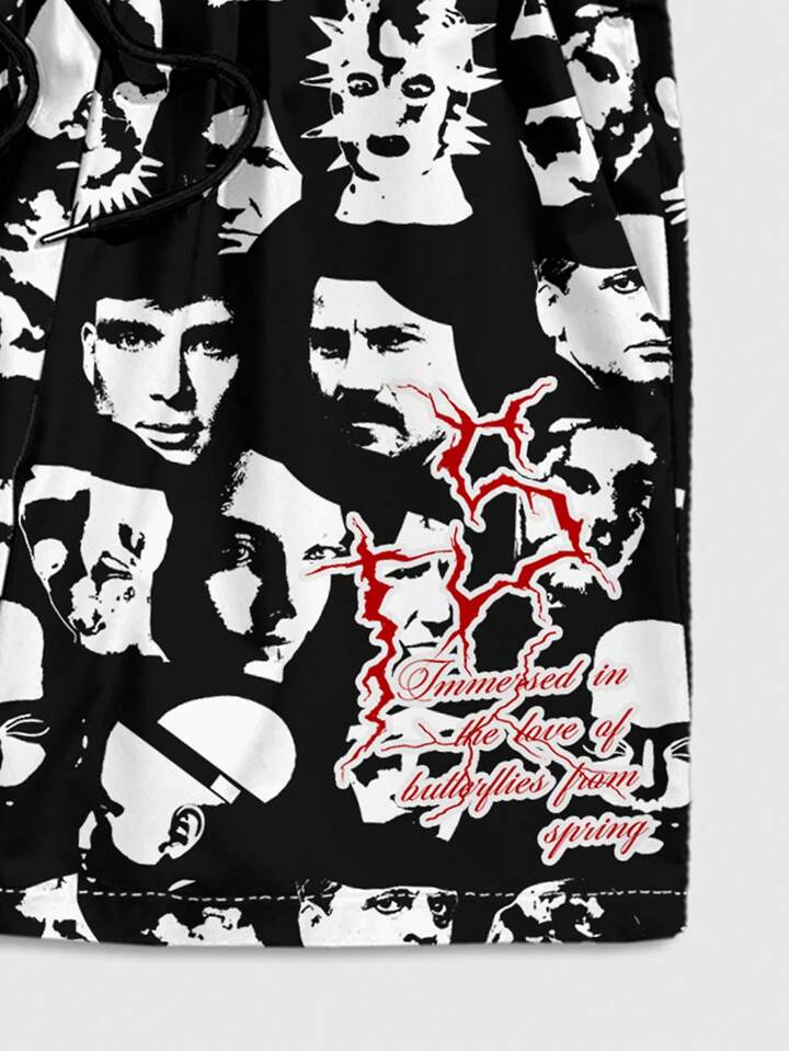 Street Life Pantalones cortos con cintura con cordón para hombres con estampados de retratos y letras, escuela
