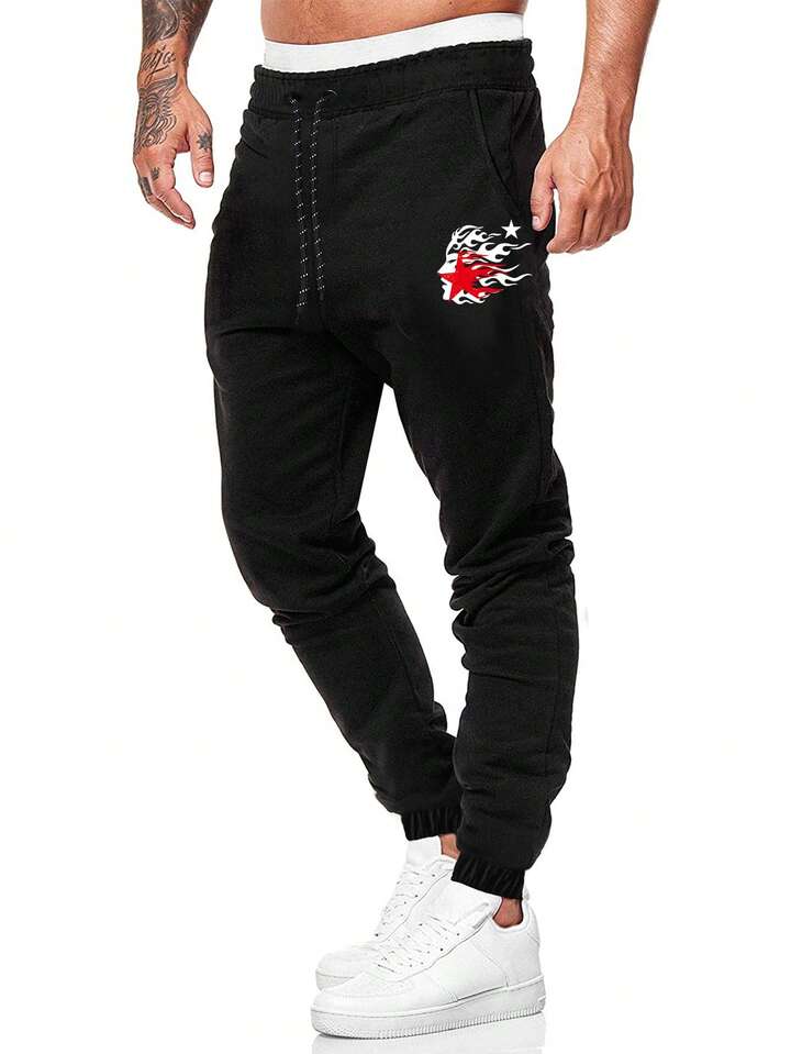 Street Life Pantalones de chándal casuales con cintura con cordón y estampado de estrellas plisados para hombres