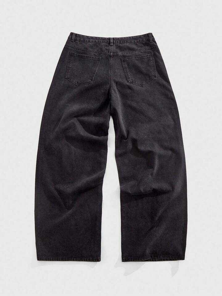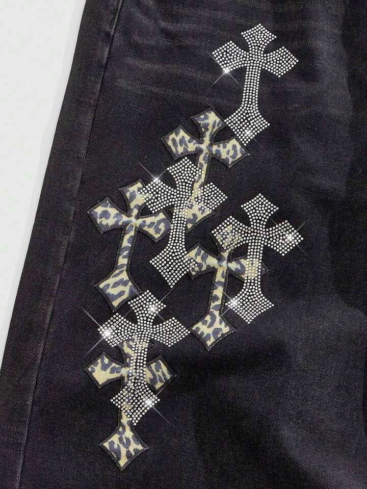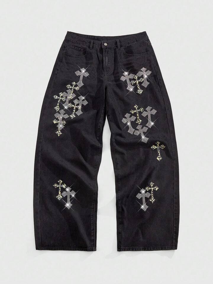 Street Life Jeans de pierna ancha con adorno de cruz de rhinestone para hombre