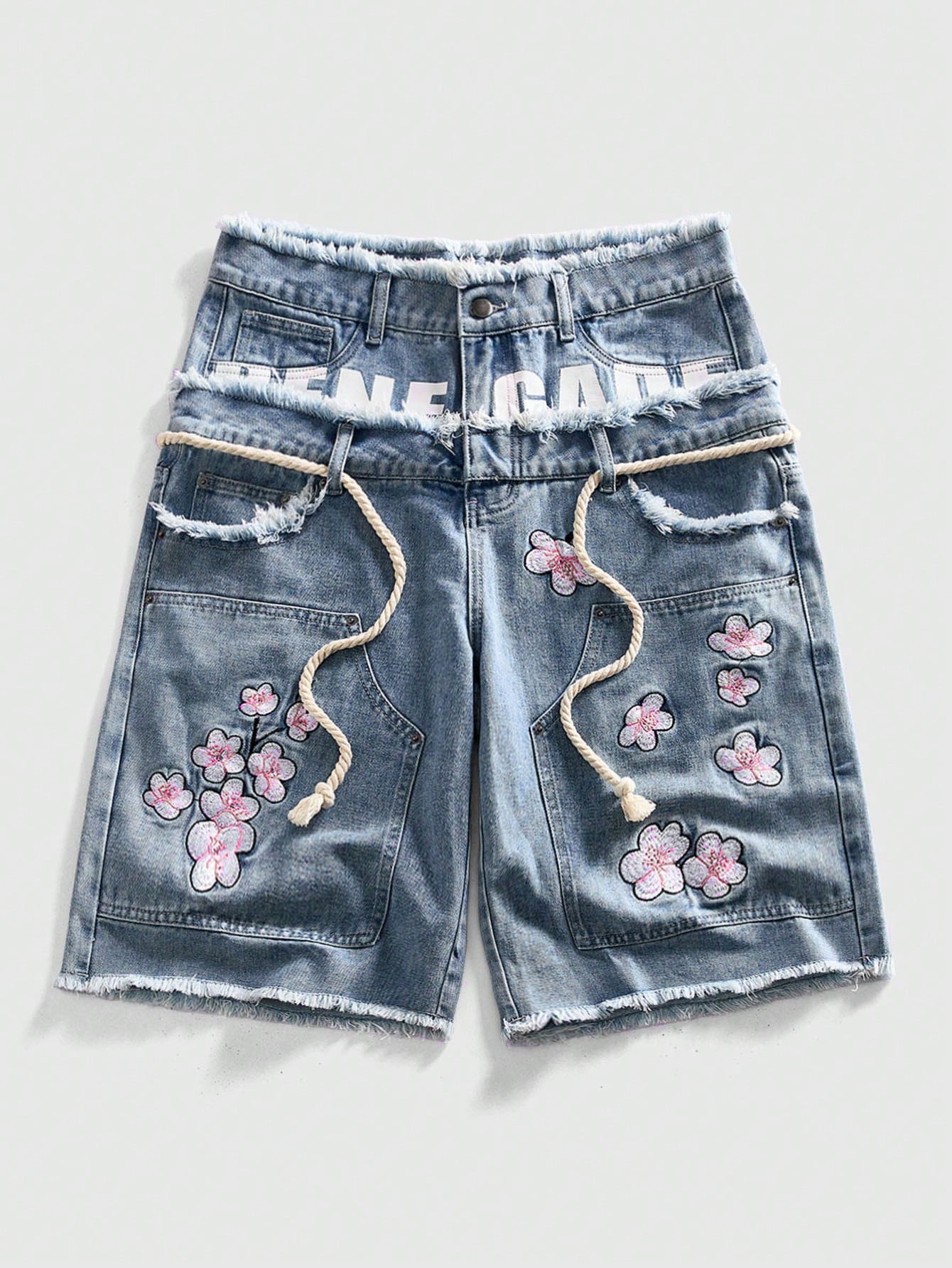 Street Life Pantalones cortos vaqueros de ajuste holgado con bordado floral y doble cintura para hombre