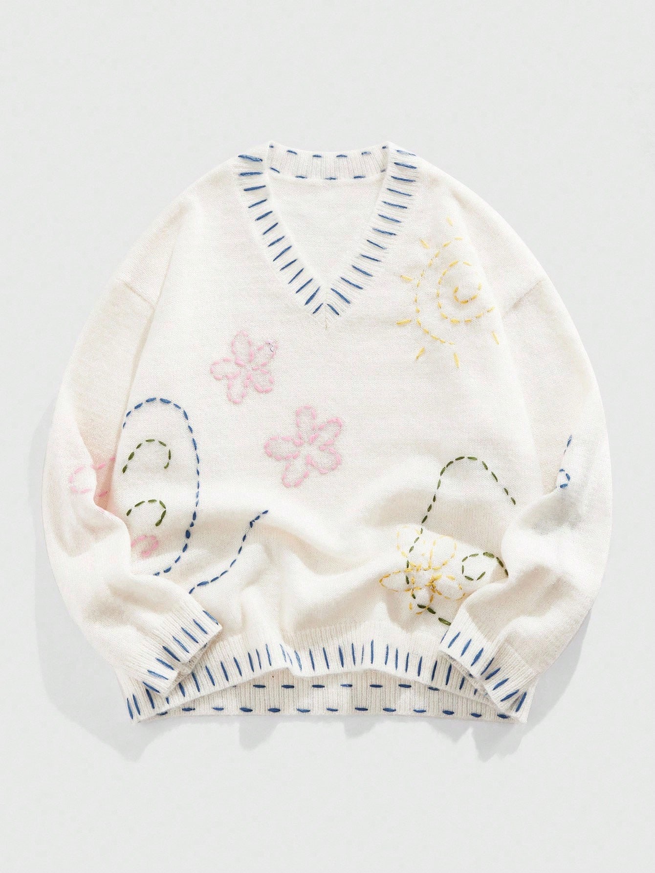 Suéter casual holgado de manga larga con cuello en V y bordado floral para hombre