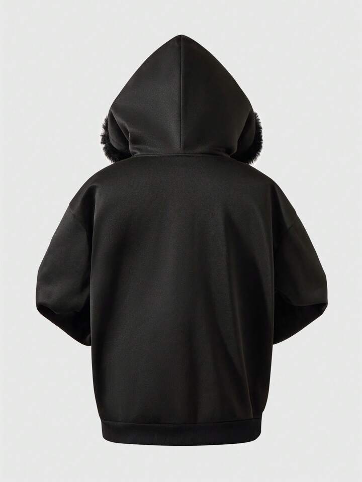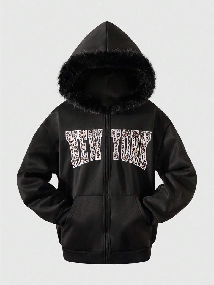 Street Life Sudadera de felpa con cuello de piel, bordado de letras y estampado de leopardo para hombre