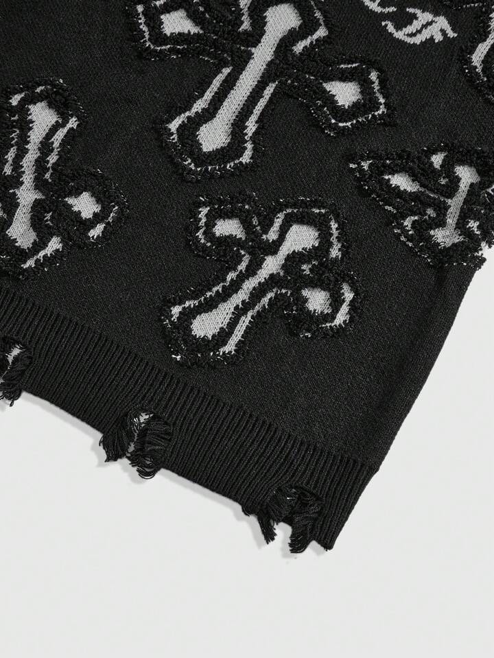 Street Life Suéter casual de cuello redondo de manga larga con grafico jacquard y bajo deshilachado para hombre