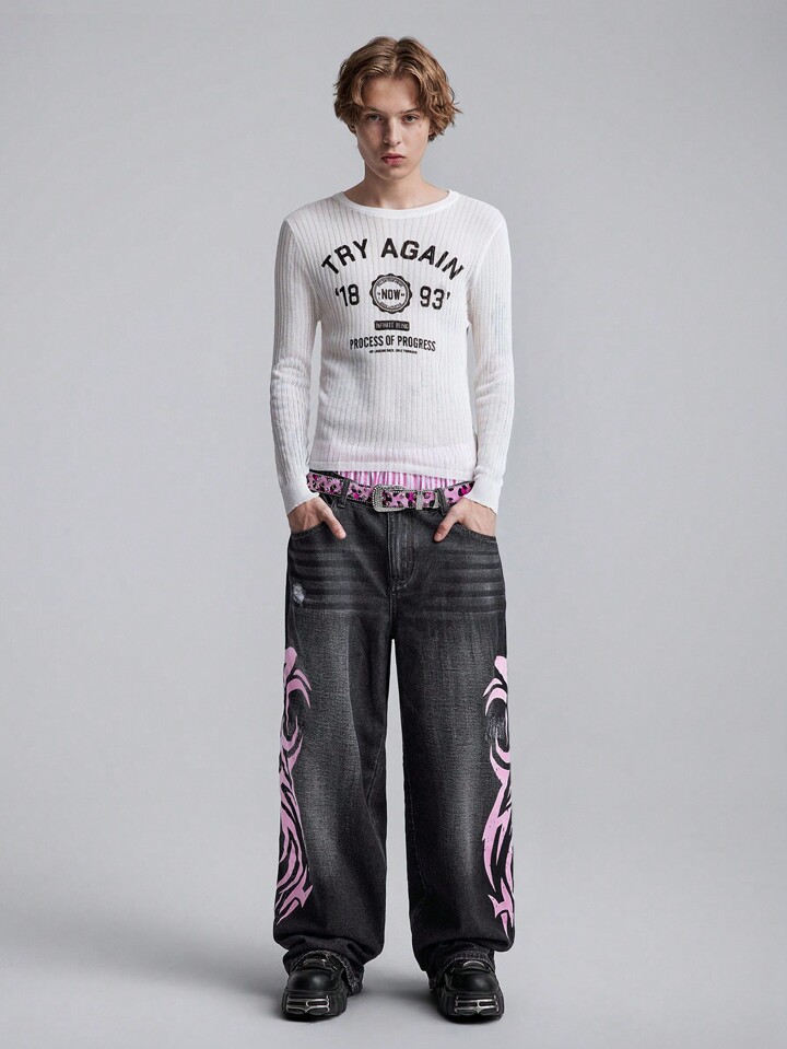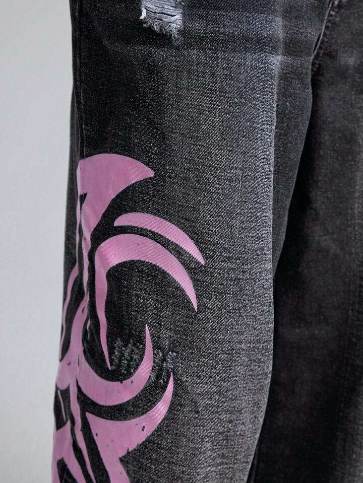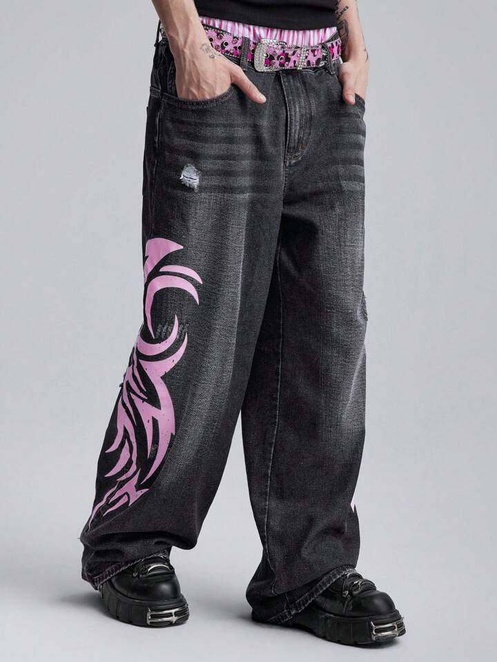 Street Life Jeans holgados y sueltos con piernas anchas, bolsillos con estampado gráfico para hombres