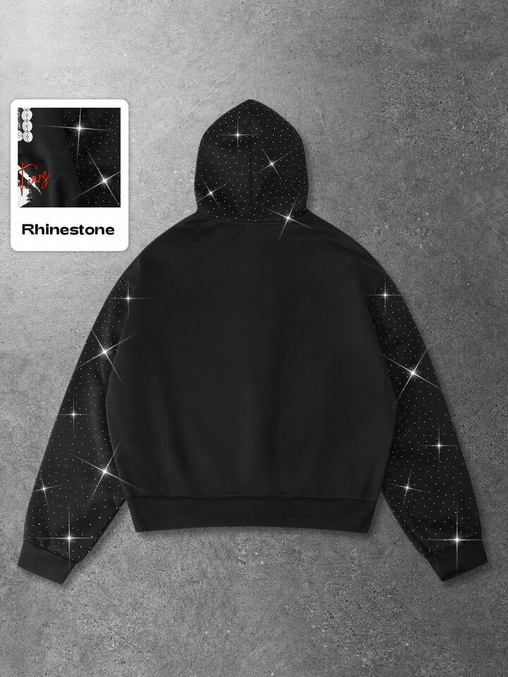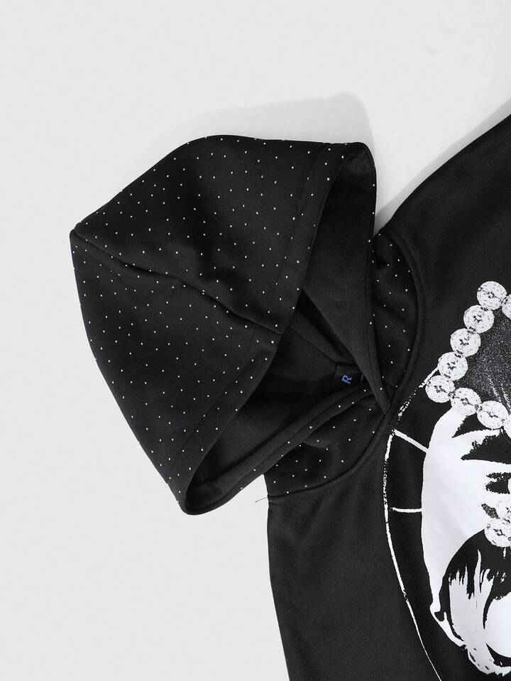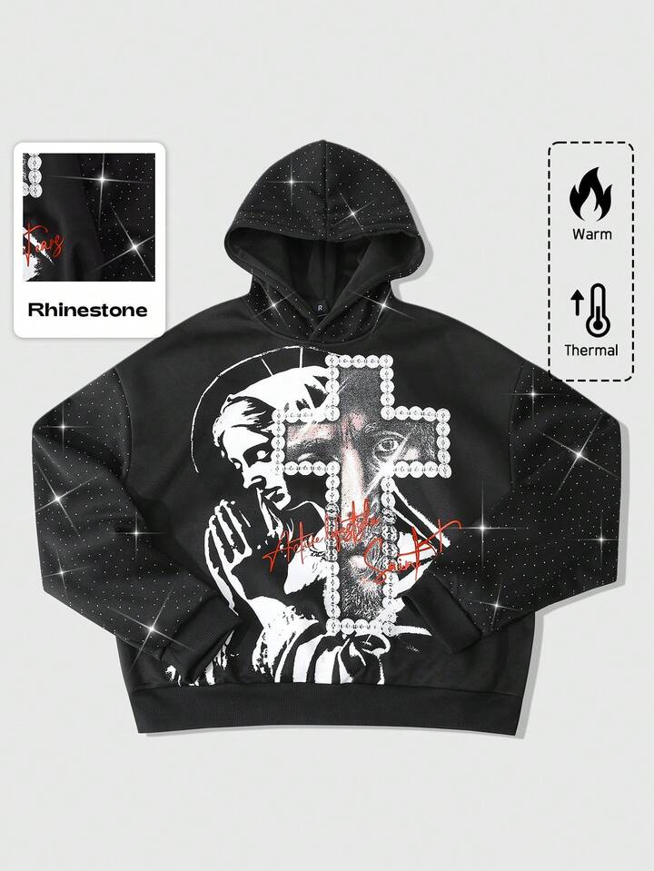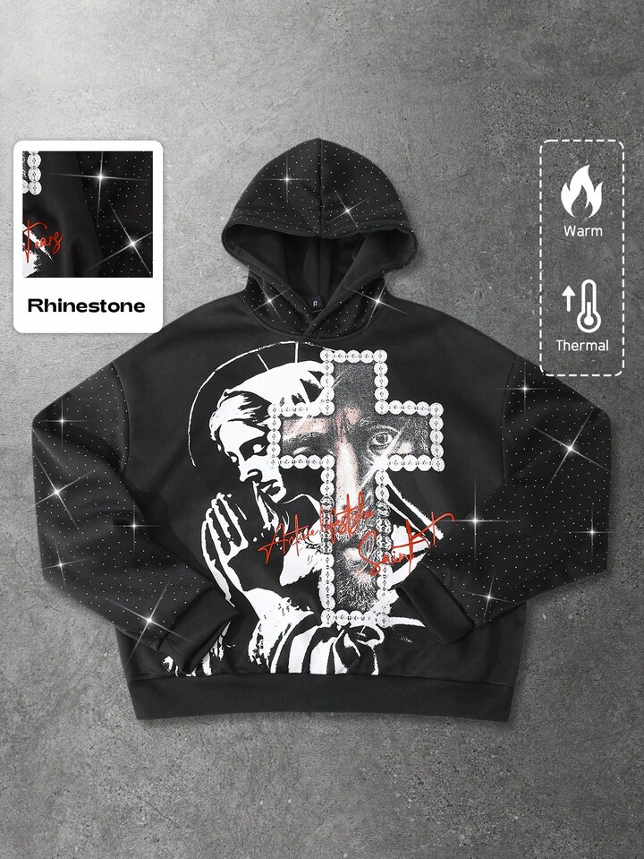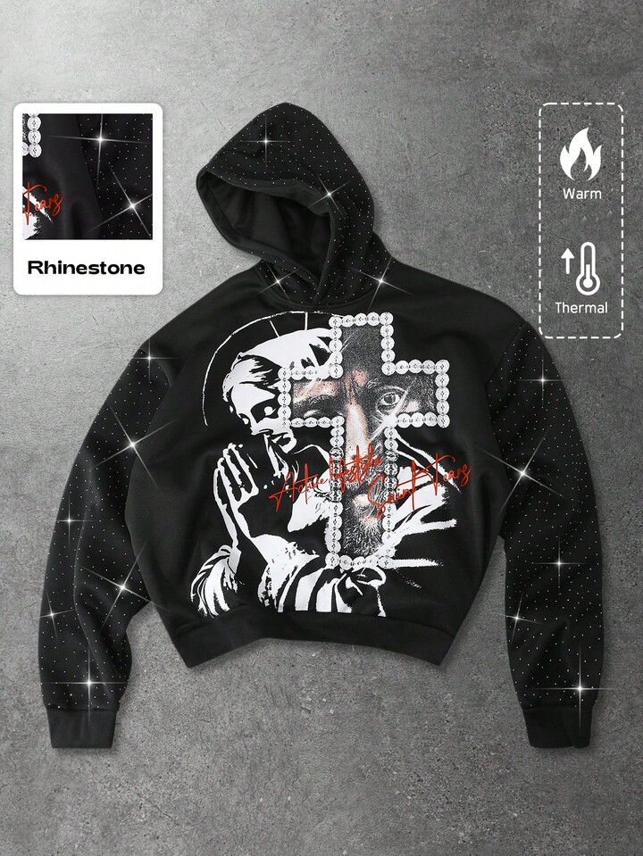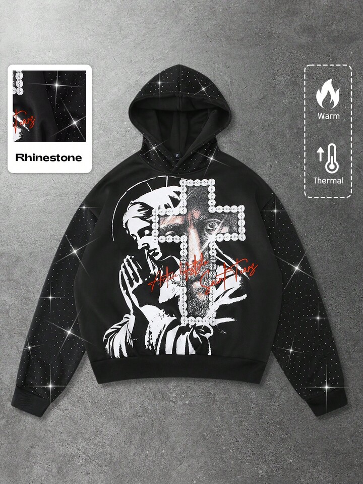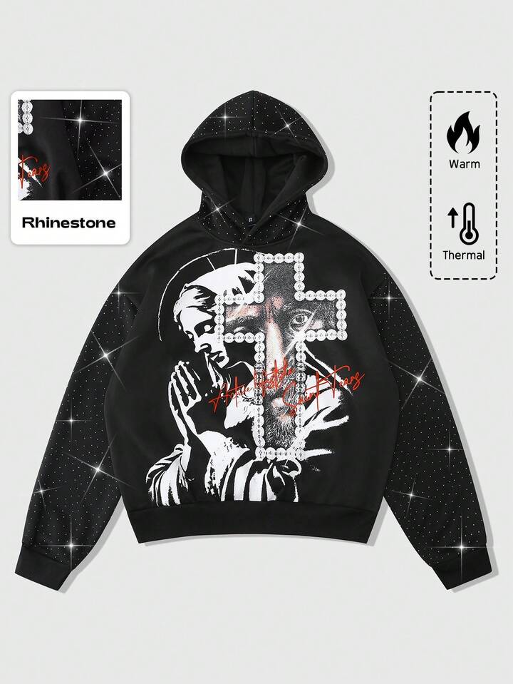 Street Life Sudadera con capucha para hombre, Jesús, Virgen María, Cruz, Texto en inglés impreso, Parche de strass, Estilo callejero americano, Otoño/Invierno