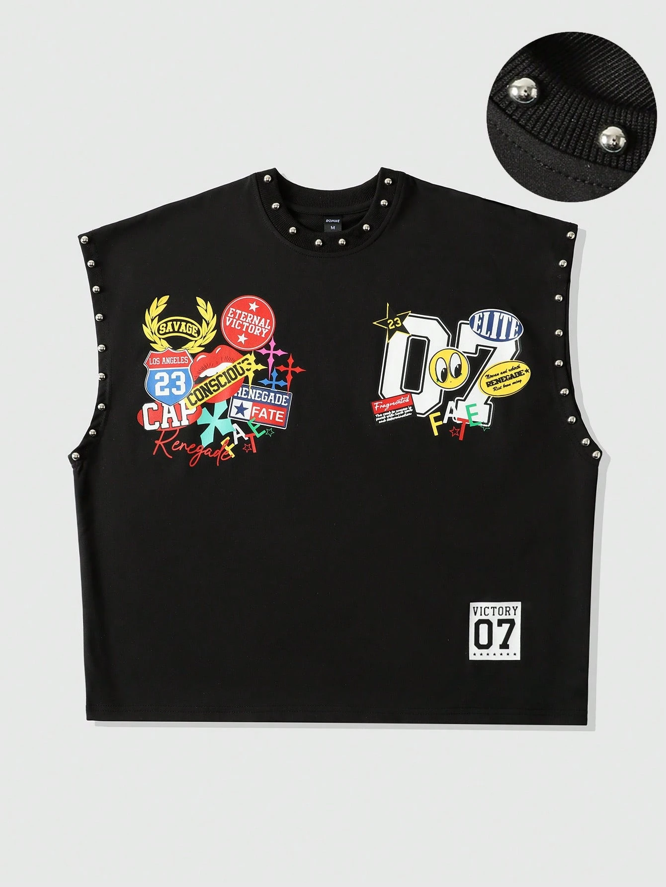 Street Life Camiseta de tirantes casual con cuello redondo, estampado de letras y dibujos animados, y remaches para hombre