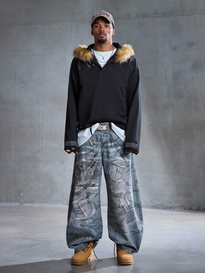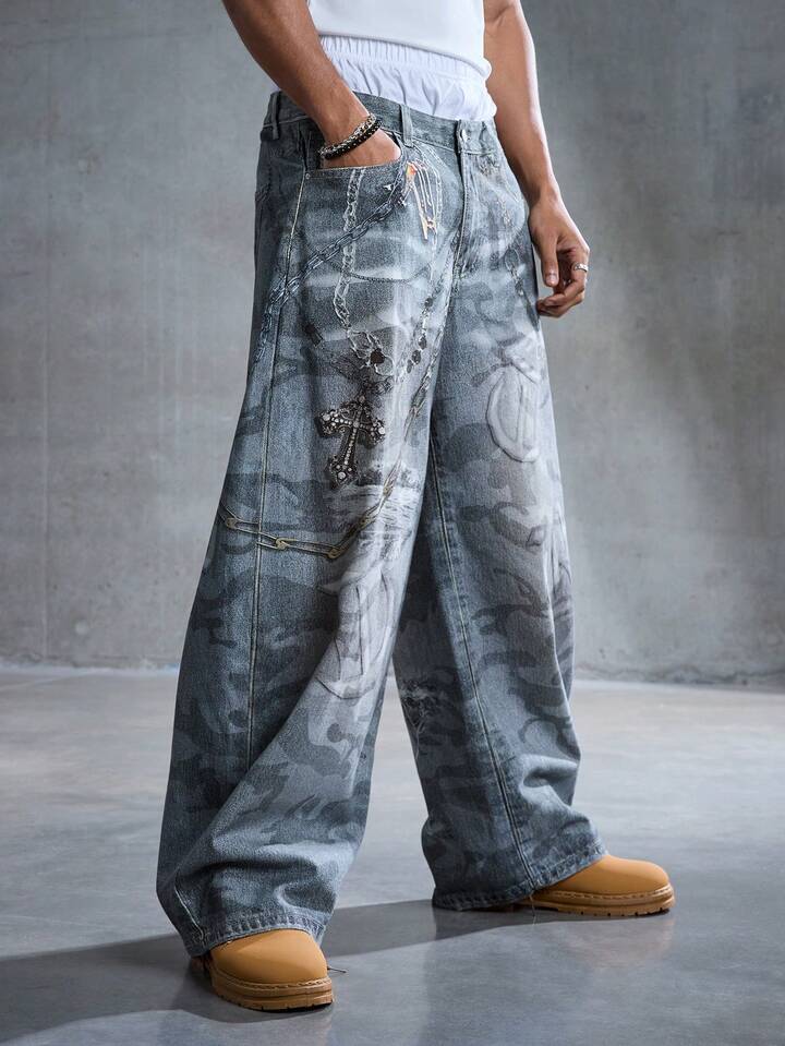 Street Life Jeans casuales de pierna ancha y ajuste holgado con gráfico de letra en el bolsillo para hombres