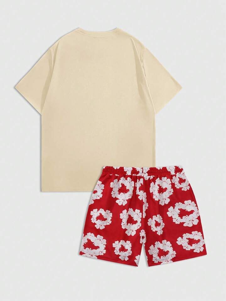 Street Life Conjunto de camiseta de manga corta con cuello redondo y estampado de letras y labios, talla grande pantalón corto con cordón en la cintura para hombres