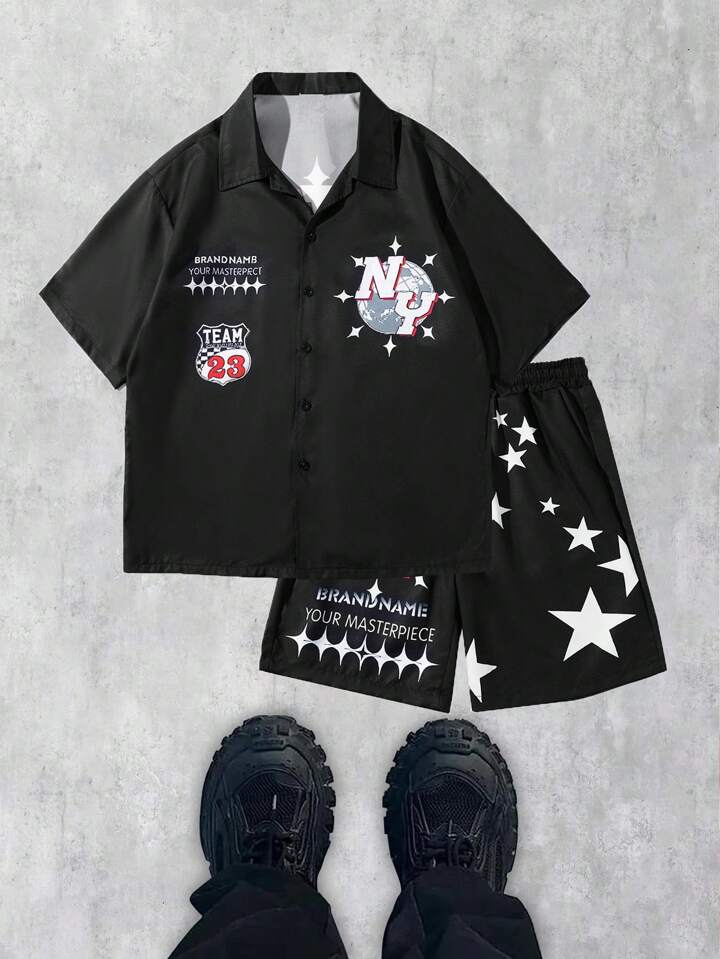 Street Life Conjunto de 2 piezas de camisa de manga corta con estampado de letras y pantalones cortos para hombre, adecuado para uso diario en primavera/verano