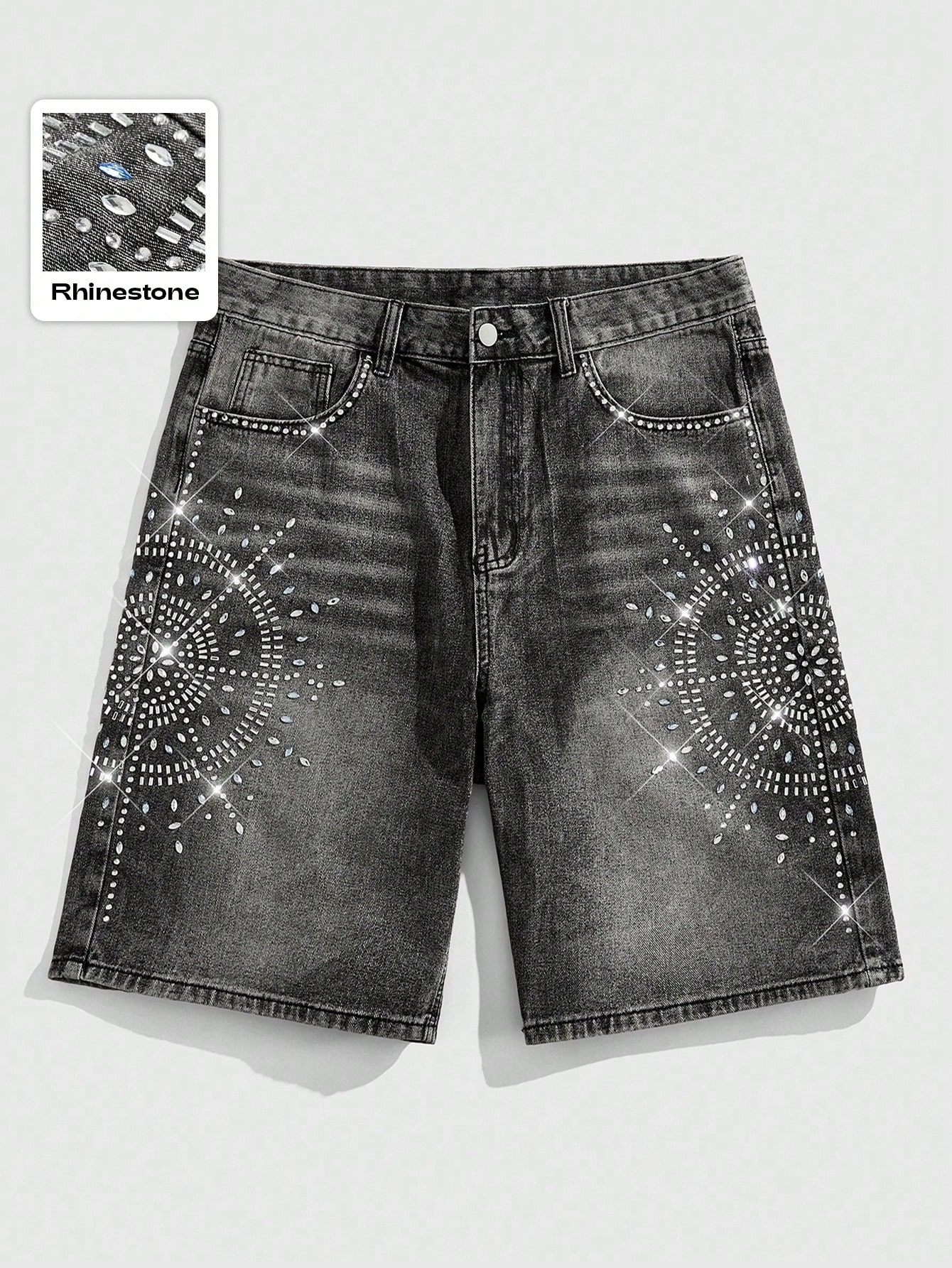 Street Life Pantalones cortos de mezclilla con aplicaciones de rhinestones para hombres, corte holgado