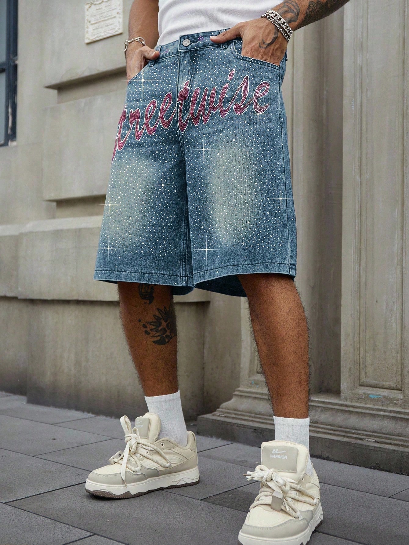 Street Life Pantalones cortos de mezclilla con aplicaciones de rhinestones para hombre, corte holgado