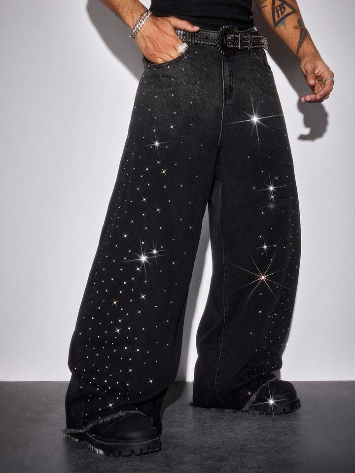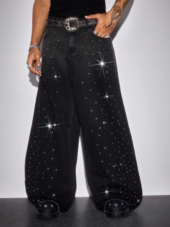 Street Life Jeans de pierna ancha con bolsillo con aplicaciones de rhinestones, estilo grunge