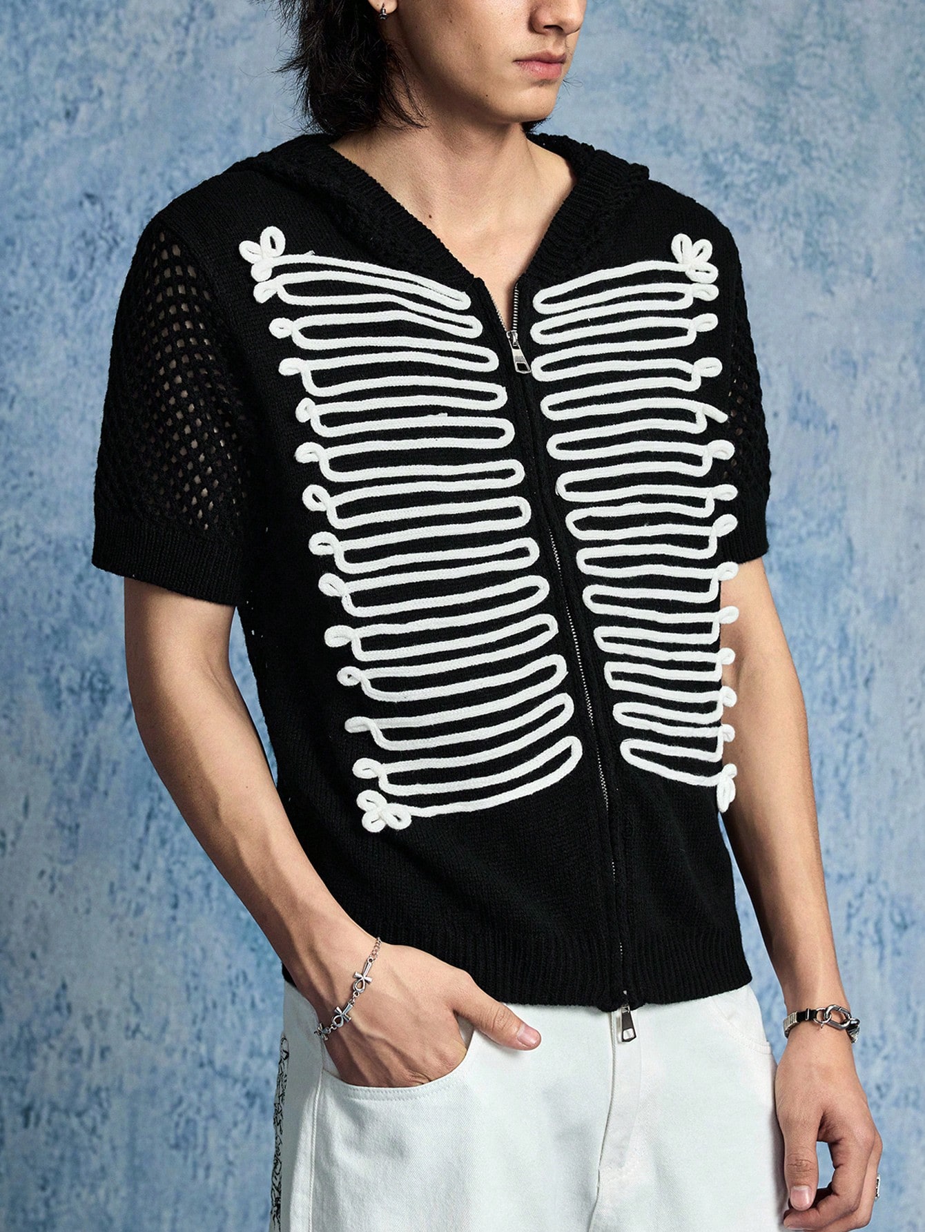 Street Life Cárdigan de punto con capucha de manga corta y estampado minimalista para hombre