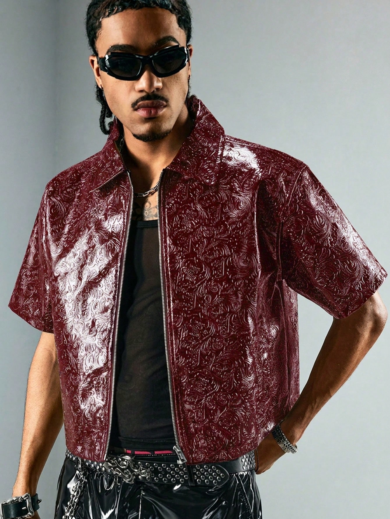 Street Life Camisa de manga corta con cremallera y textura de PU para hombres
