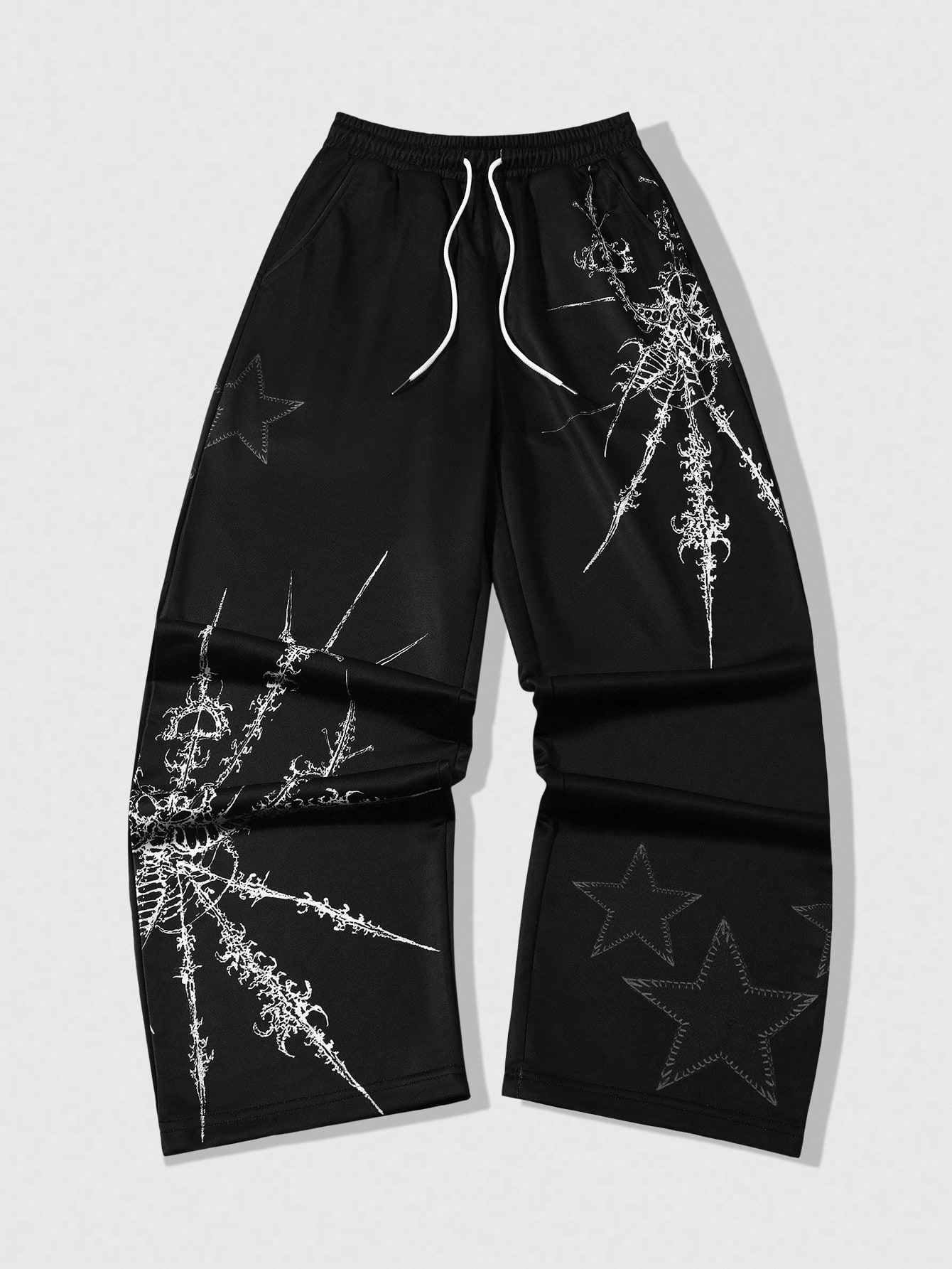 Street Life Pantalones rectos casuales de lavado de nieve con cintura con cordón y estampado gótico de pentagrama para hombre, otoño