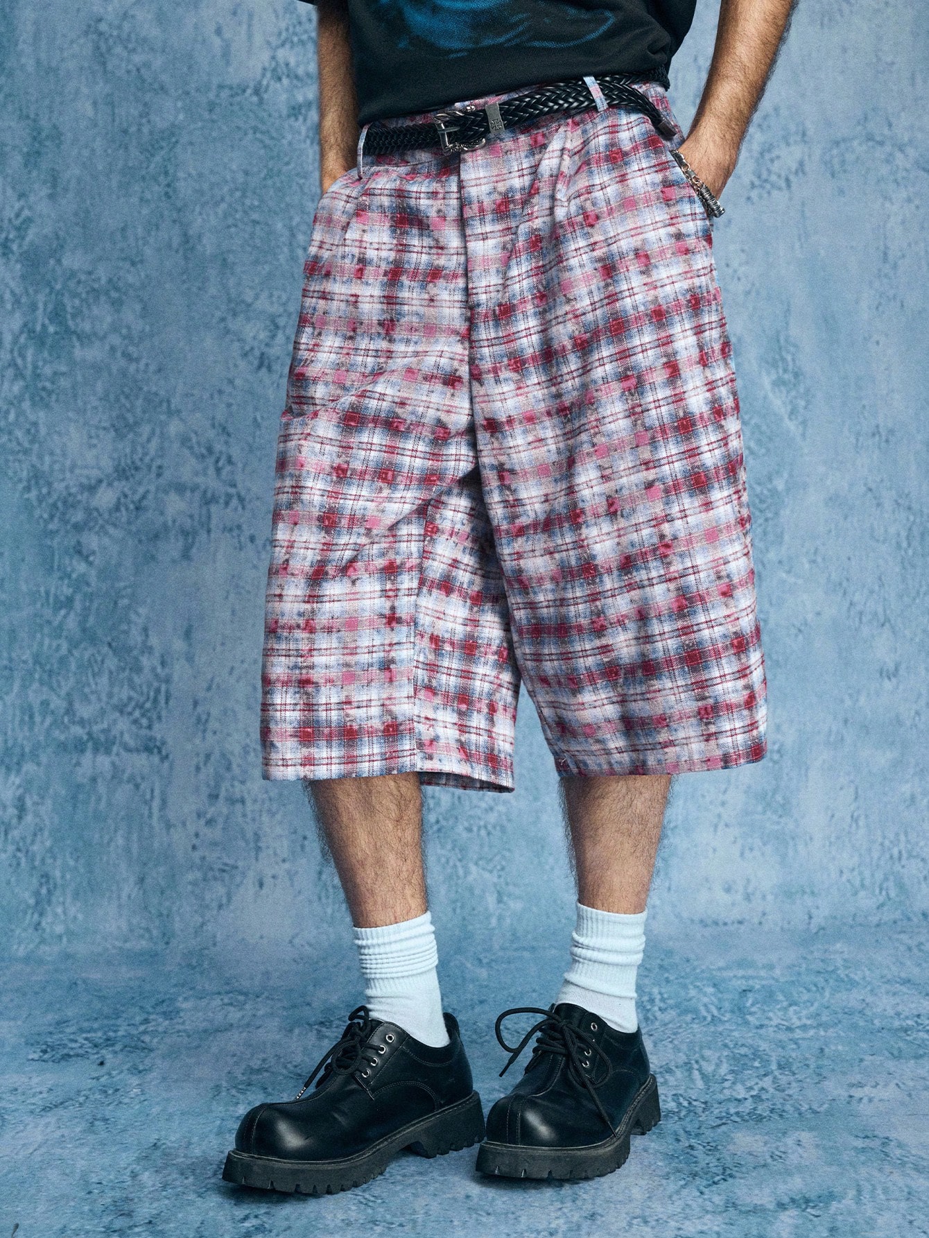 Street Life Pantalones cortos casuales holgados con bolsillo y pliegues a cuadros para hombres