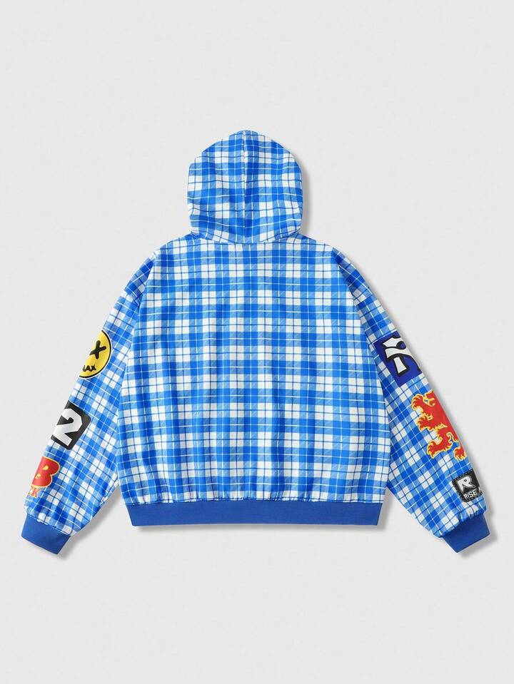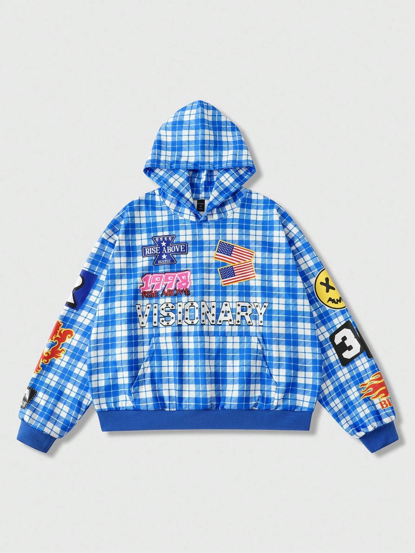 Street Life Sudadera con capucha de estilo holgado y corto con estampado a cuadros para hombre, otoño