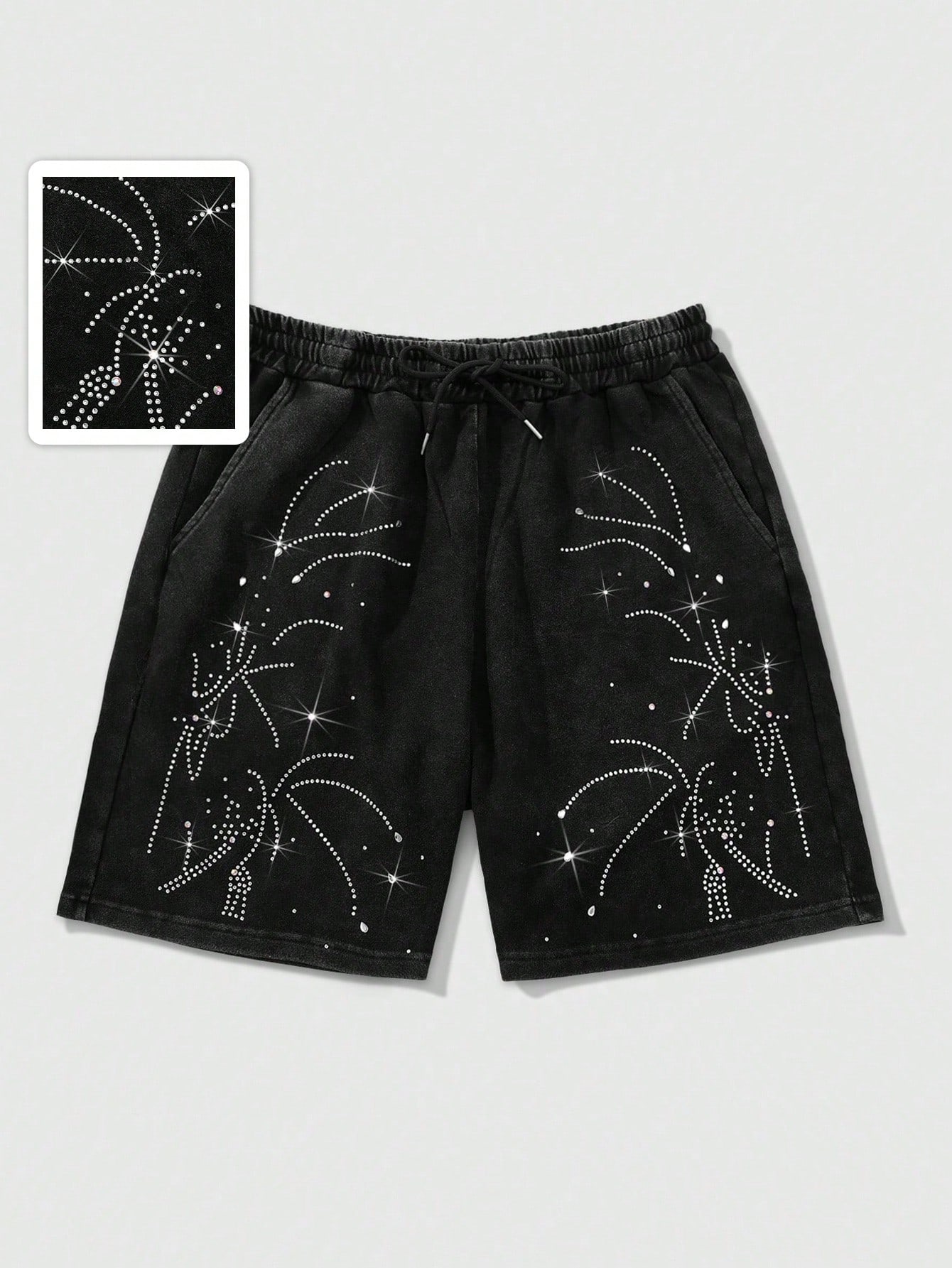 Street Life Pantalones cortos de verano para hombres con un nuevo diseño de estilo callejero estadounidense, con decoración de coloridos y brillantes diamantes de imitación. Presenta un patrón disperso de pequeñas gemas brillantes, diamantes y lentejuelas en verde, azul, rojo y amarillo, dando al tejido liso un aspecto brillante y visualmente atractivo, con un estilo general fresco y sencillo que resalta los detalles de los pantalones cortos