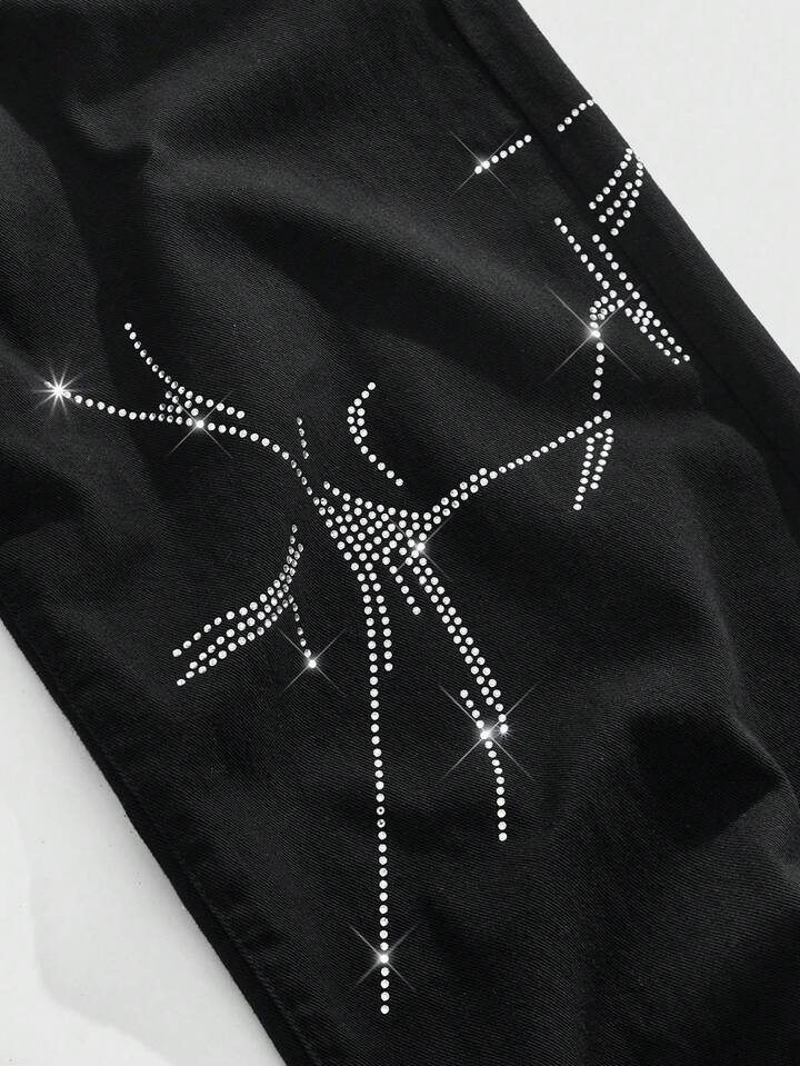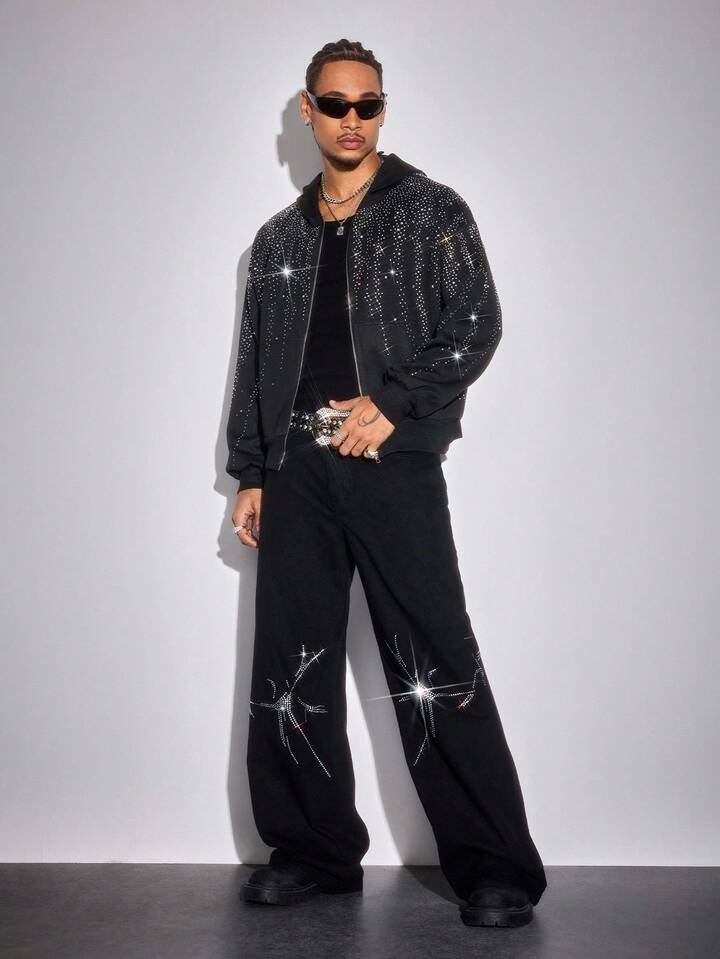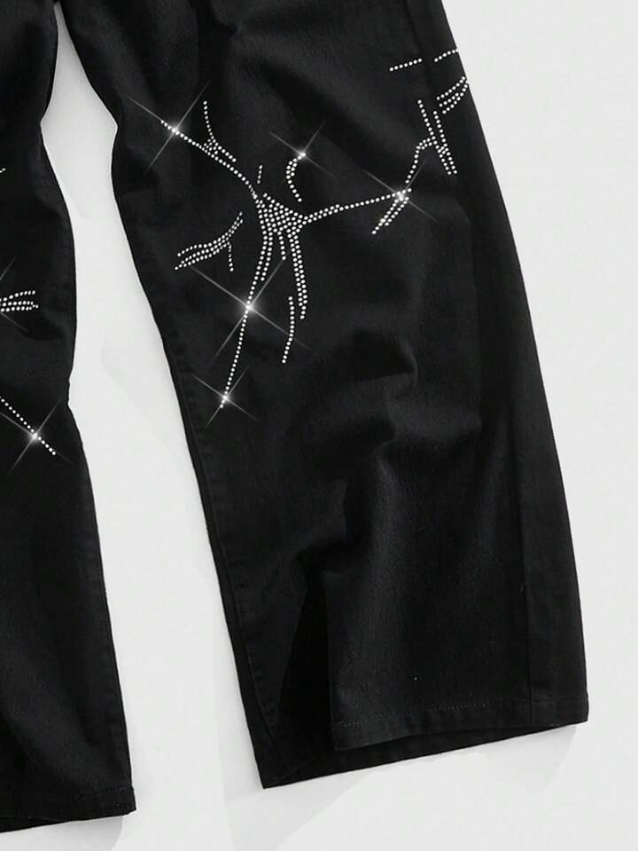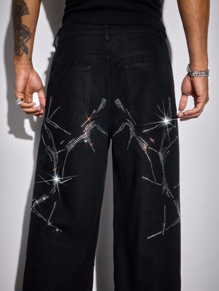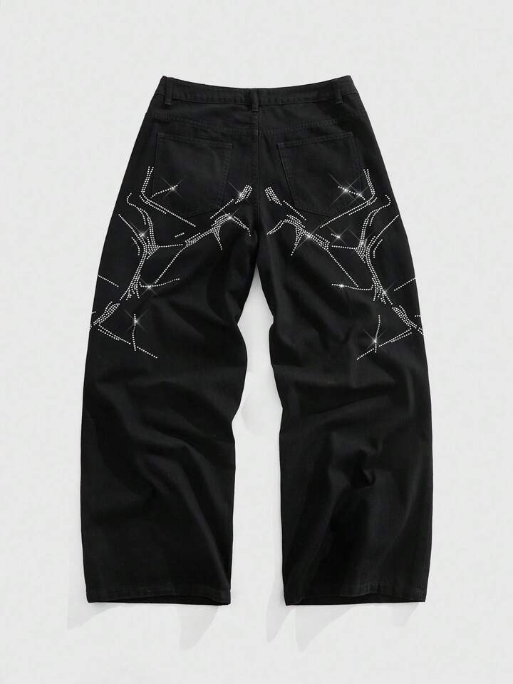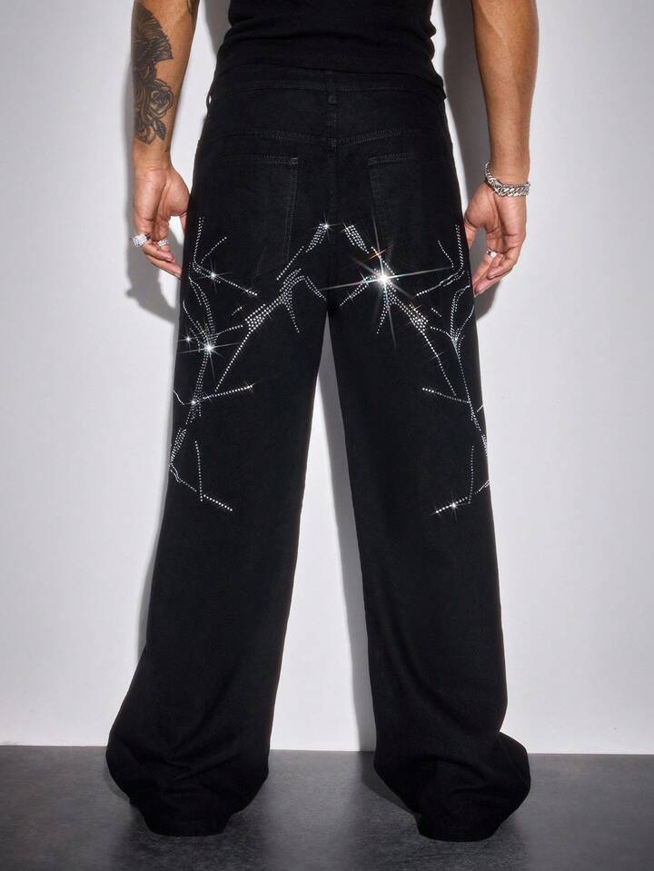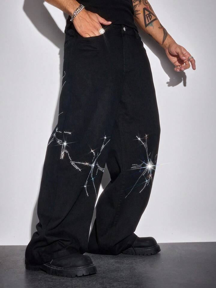 Street Life Jeans casuales anchos con bolsillo con adornos de rhinestone para hombres, estilo grunge