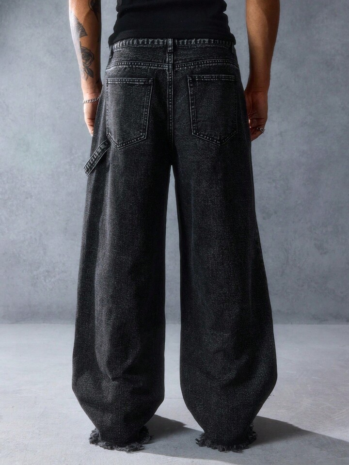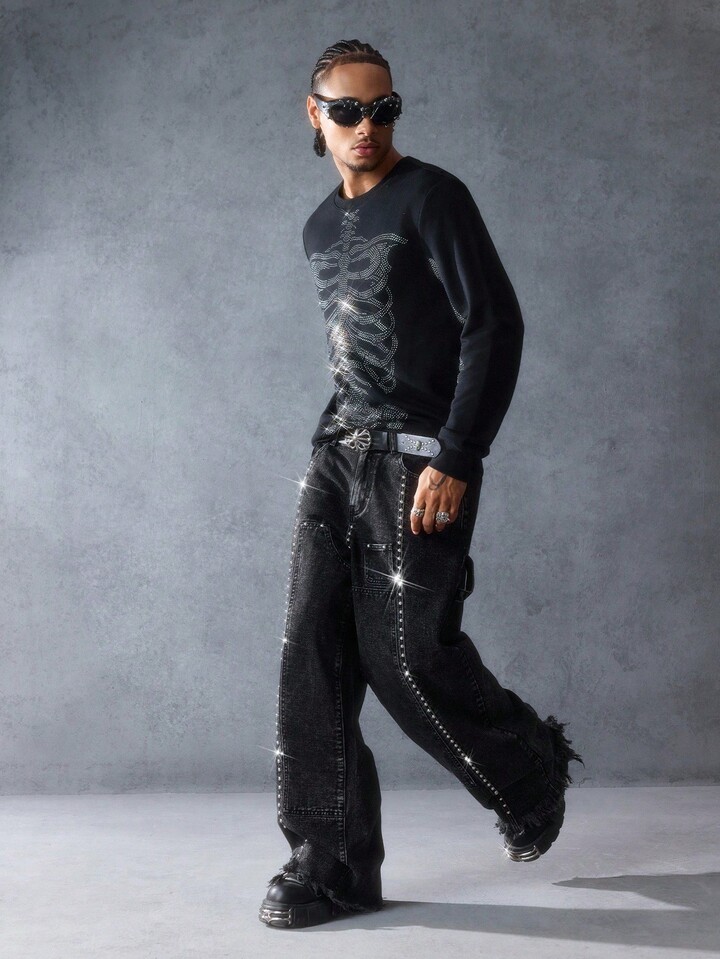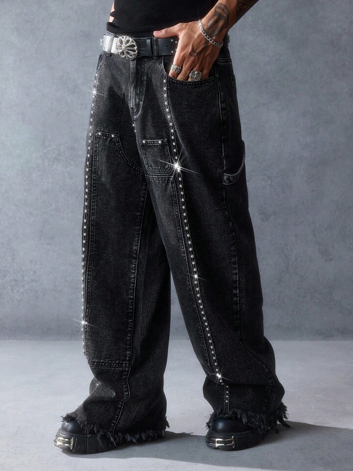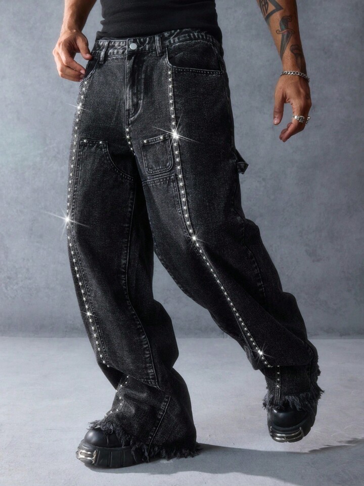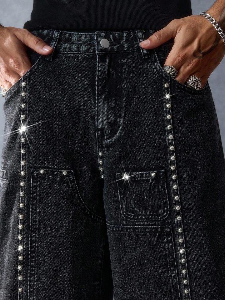Street Life Jeans casuales de pierna ancha y holgados con bolsillo con adornos de rhinestone para hombres