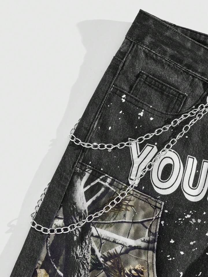 Street Life Pantalones cortos de mezclilla con cadena y estampado sencillo para hombre