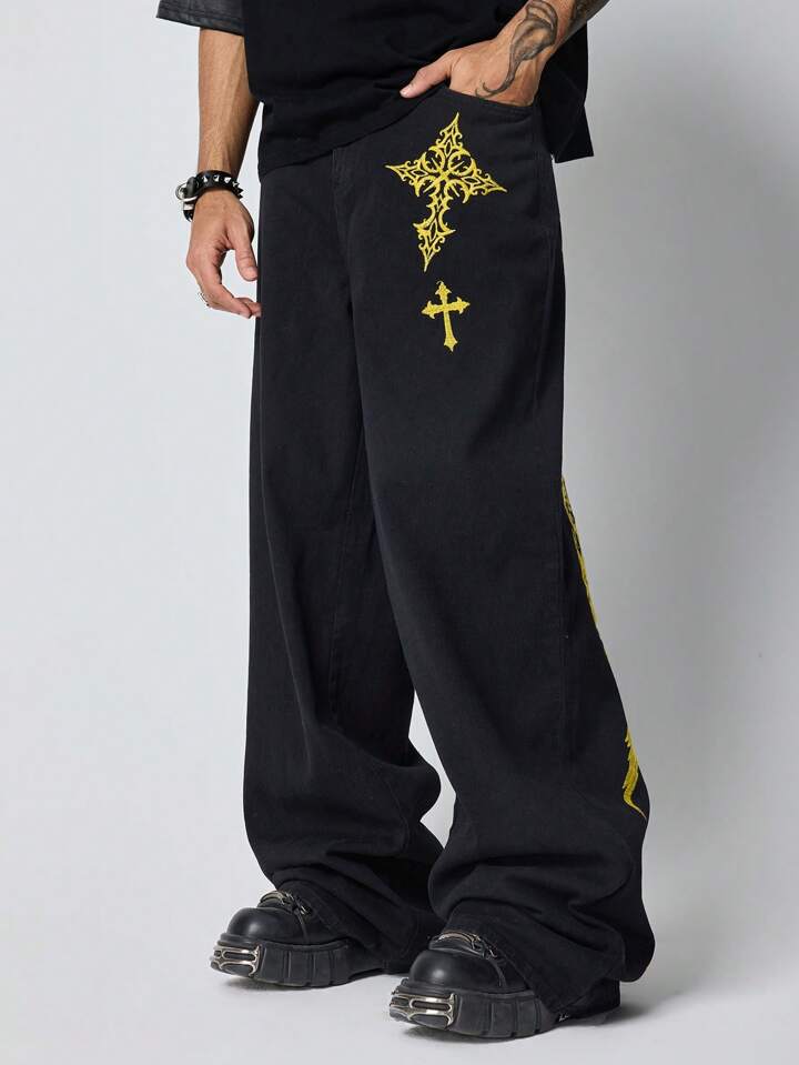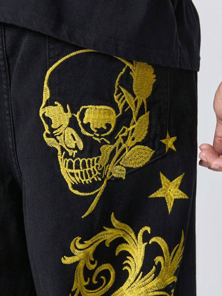 Street Life Jeans casuales de pierna ancha con estampado de calavera para hombre