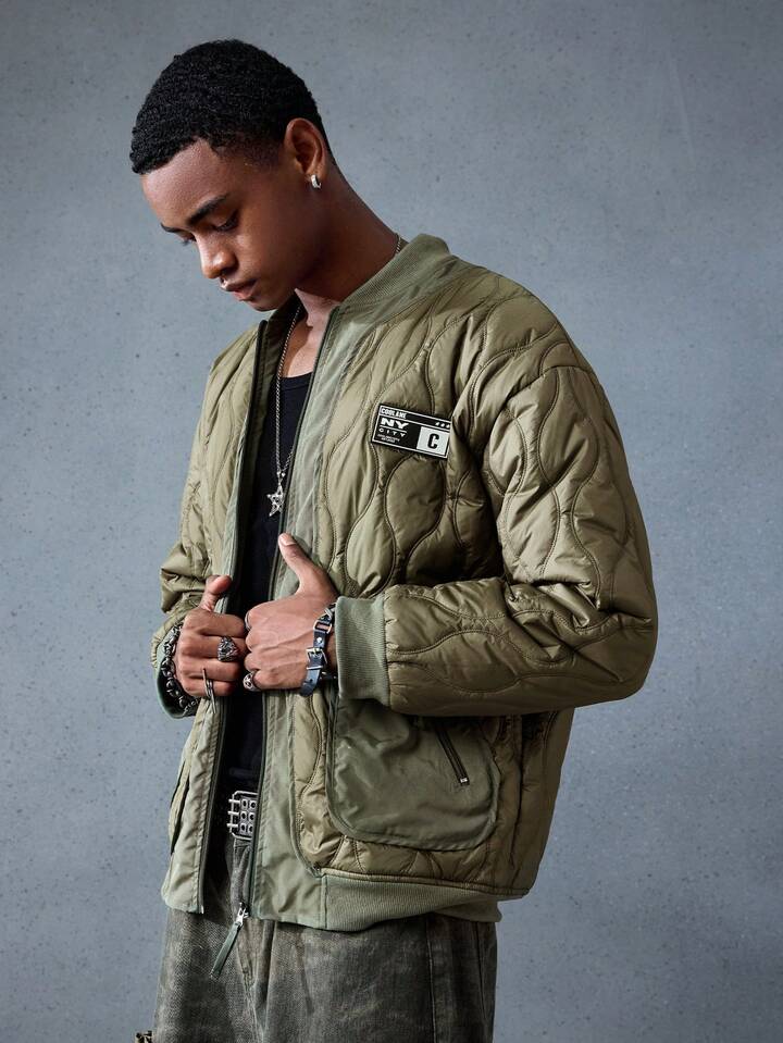Street Life Abrigo acolchado de manga larga con cremallera y parche de unicolor para hombre, para invierno