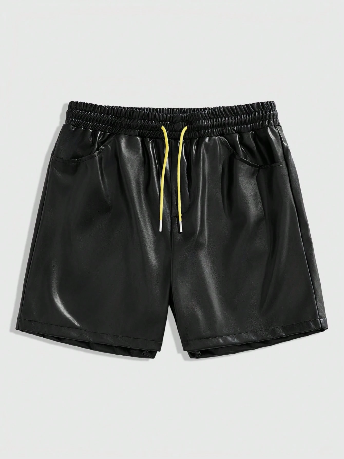 Street Life Pantalones cortos sueltos de hombre de piel de PU de unicolor con bolsillos y cordón en la cintura
