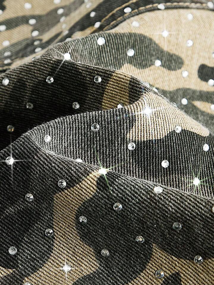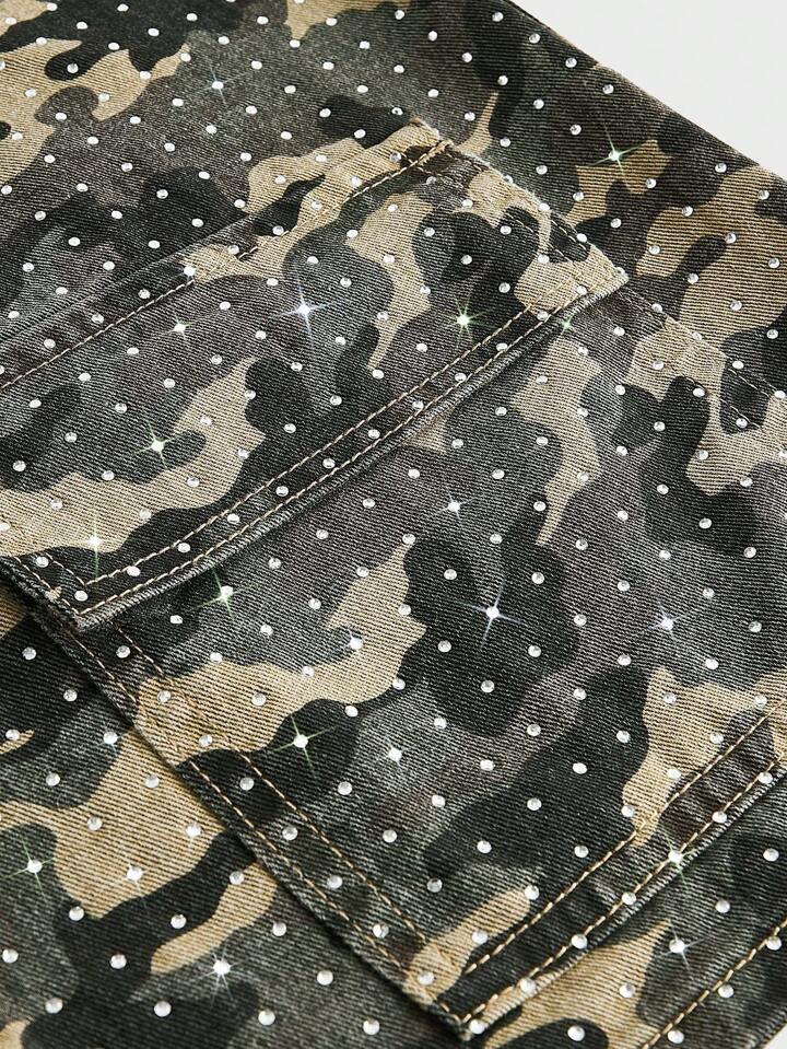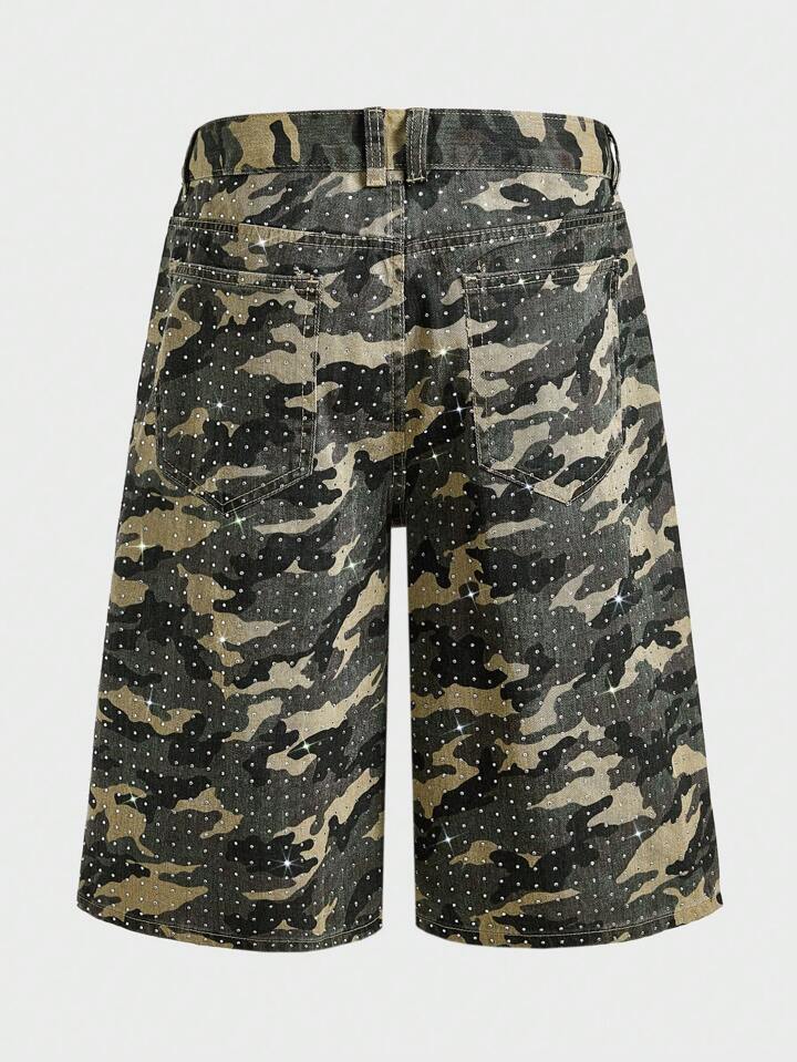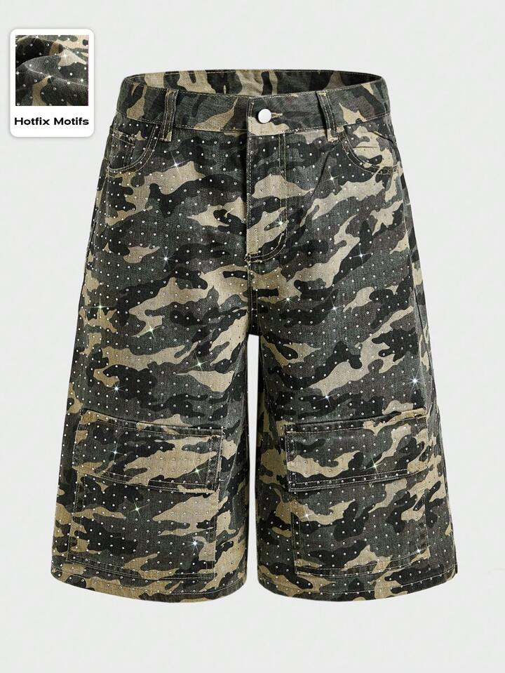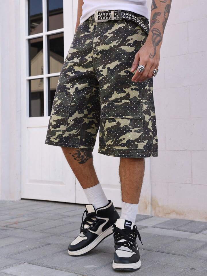 Street Life Pantalones cortos vaqueros de camuflaje con diamantes brillantes para hombre
