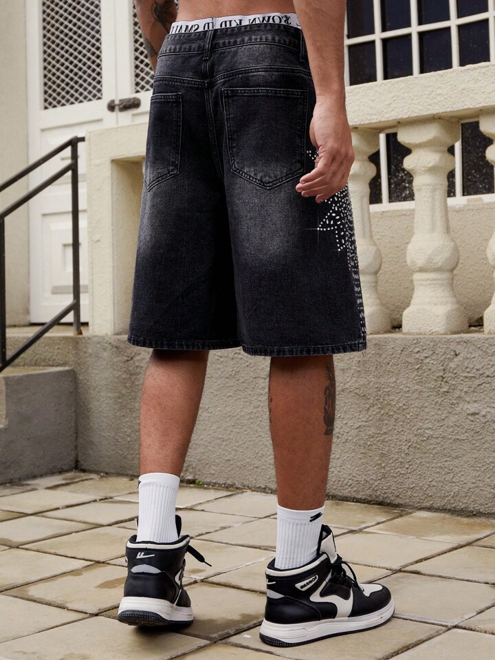 Street Life Pantalones cortos de mezclilla holgados y de pierna ancha con decoración de strass brillante para hombres, ropa de calle