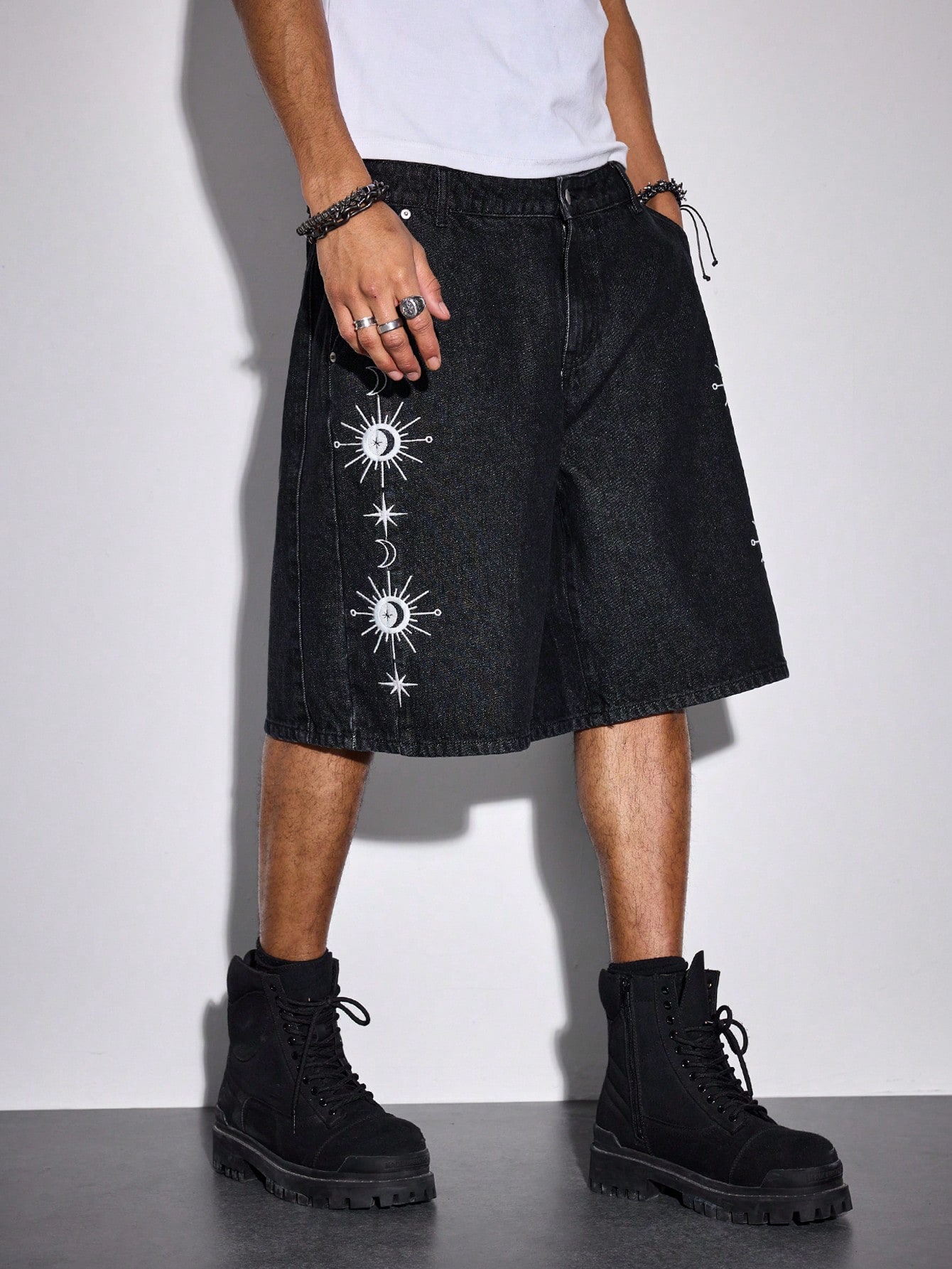 Street Life Pantalones cortos de mezclilla casuales y holgados con bordado de estrellas y lunas en el bolsillo para hombres
