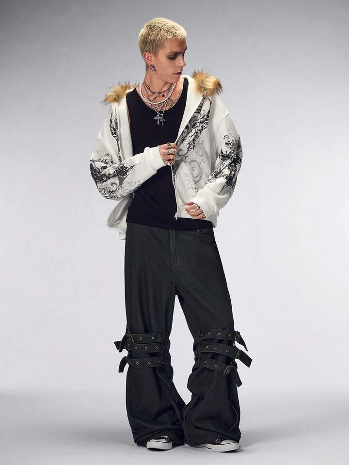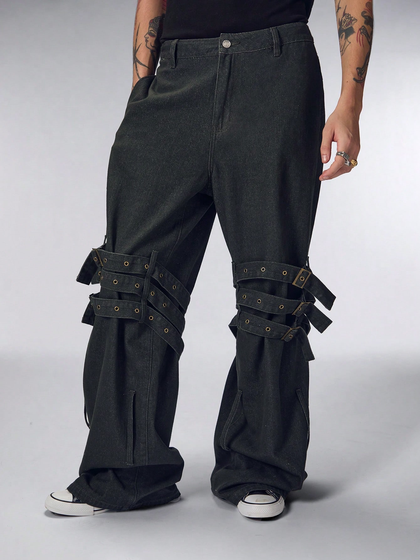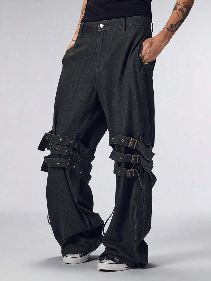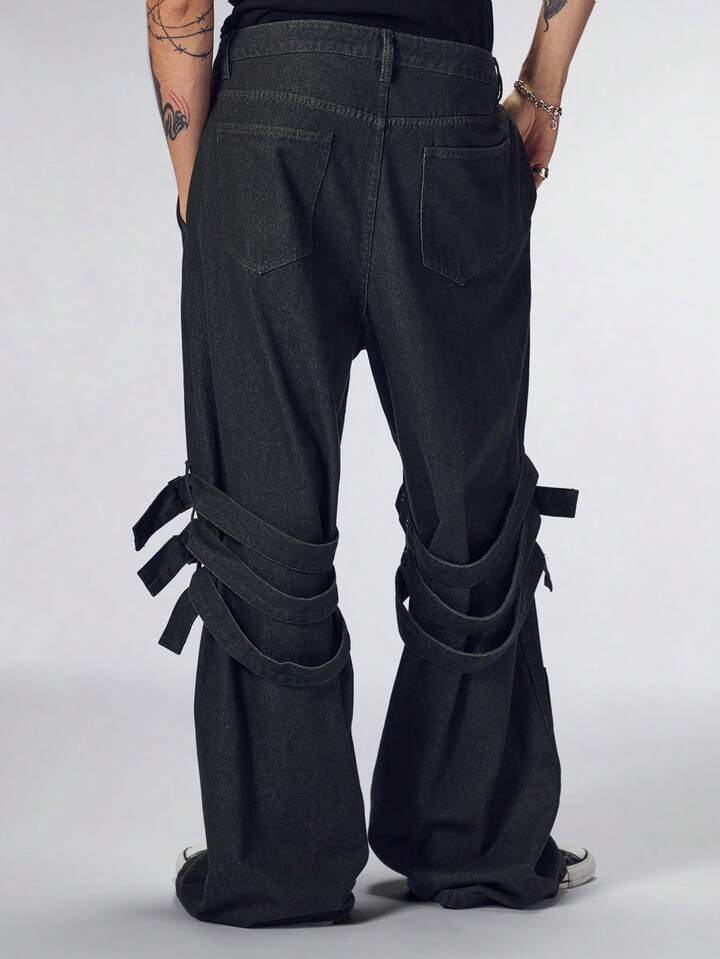Street Life Jeans rectos de hombre con lazada, de unicolor con presillas para cinturón, de corte holgado y con estilo