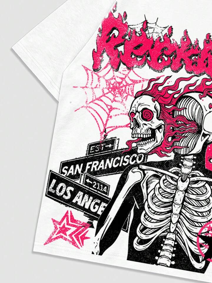 Street Life Camiseta de manga corta con estampado de calavera y letras, estilo urbano para uso casual diario para hombres