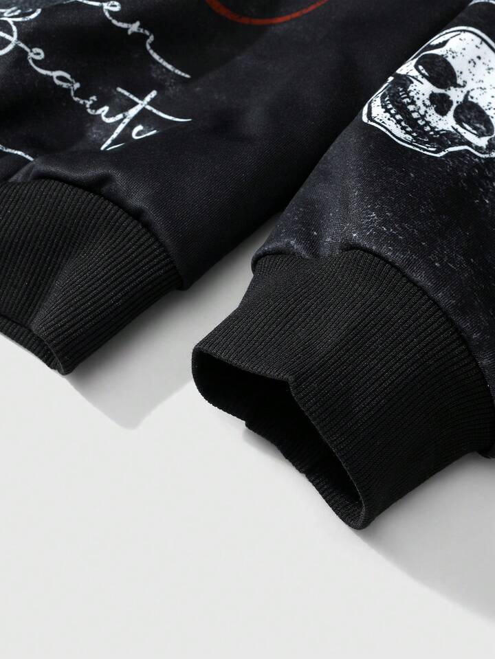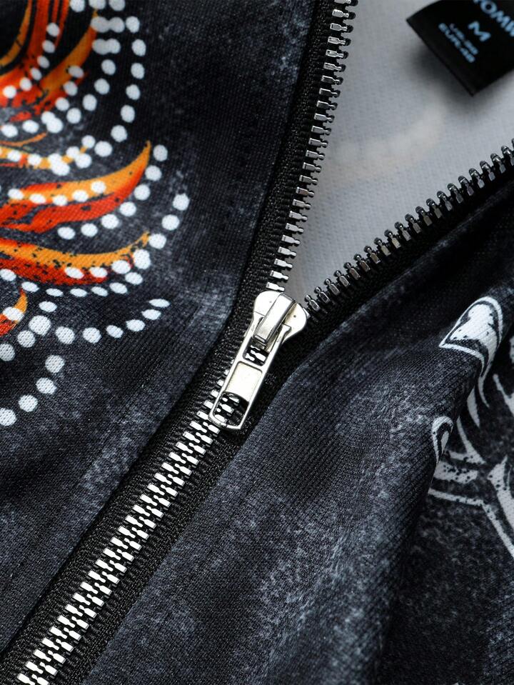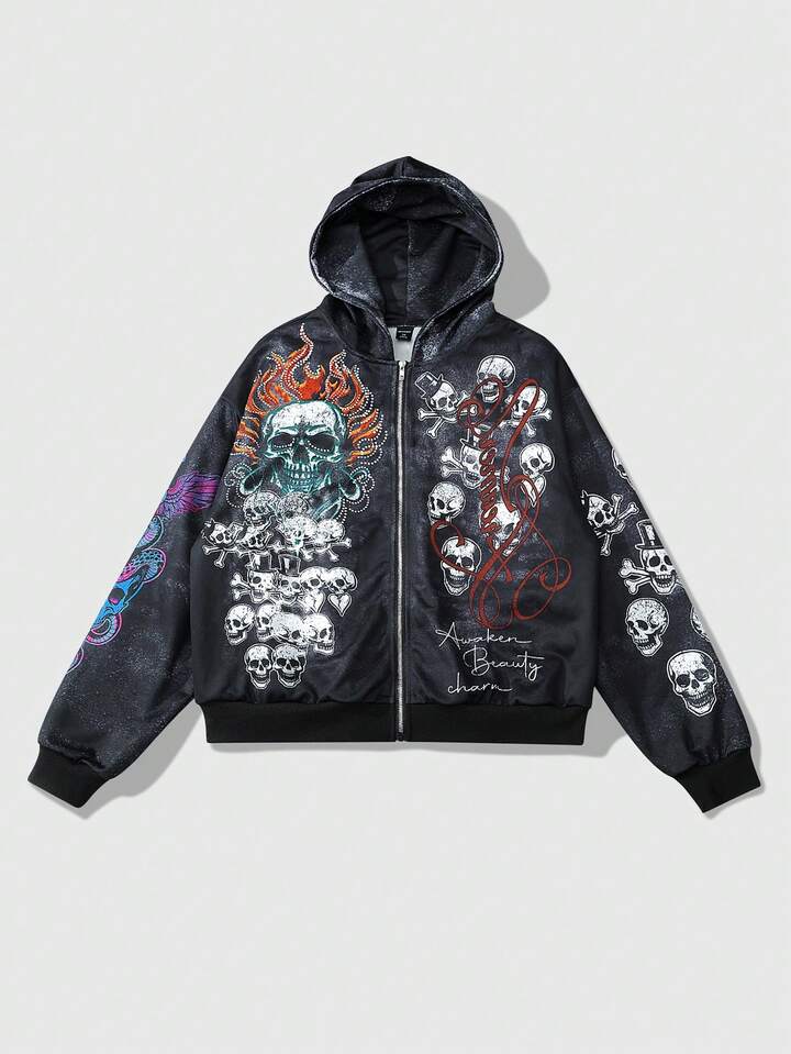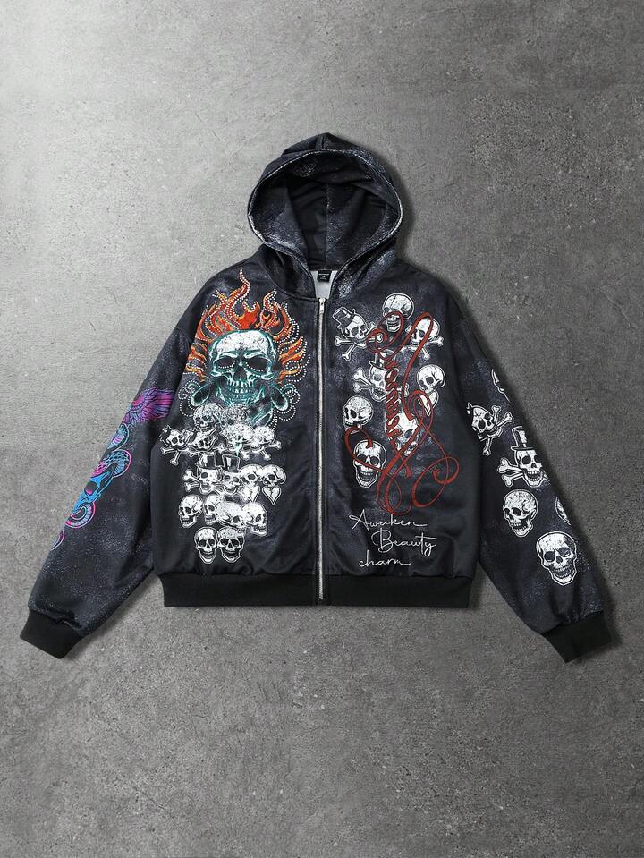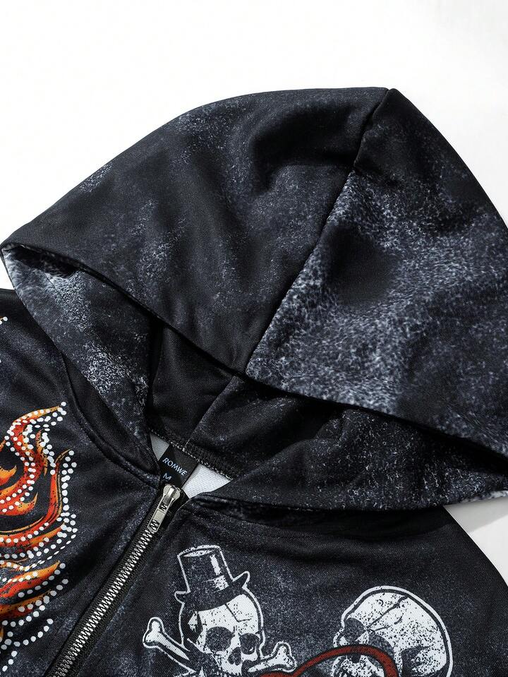 Street Life Sudadera con capucha con cremallera y estampado de calavera, estilo urbano para hombres