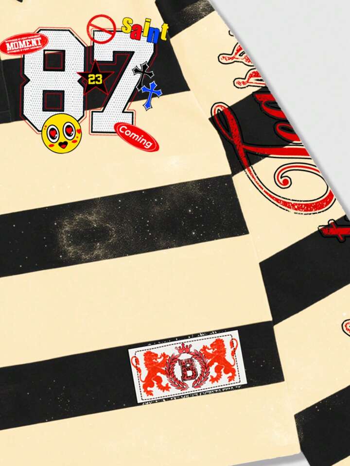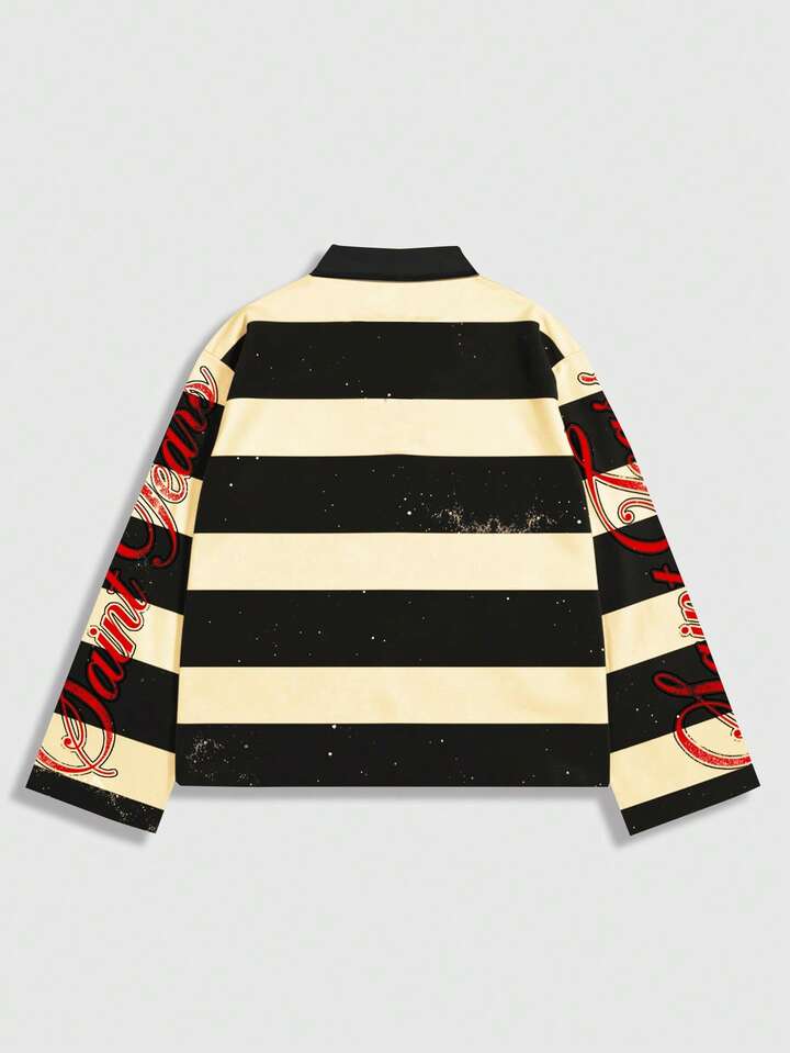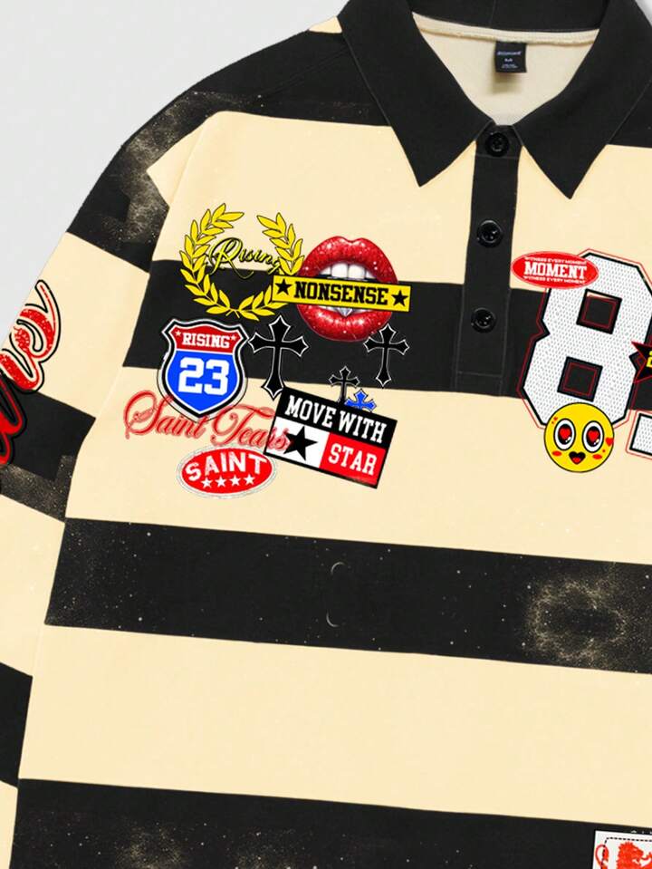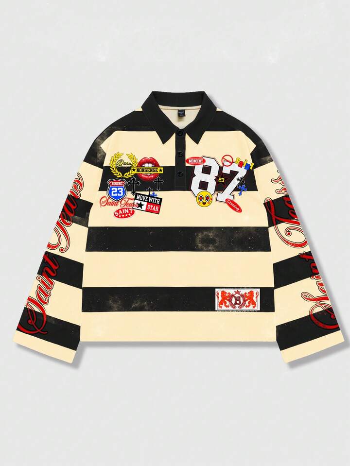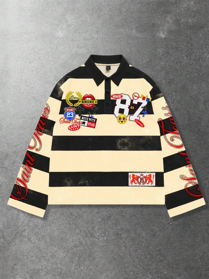 Street Life Camiseta de manga larga con cuello a rayas y estampado, estilo universitario casual para hombres