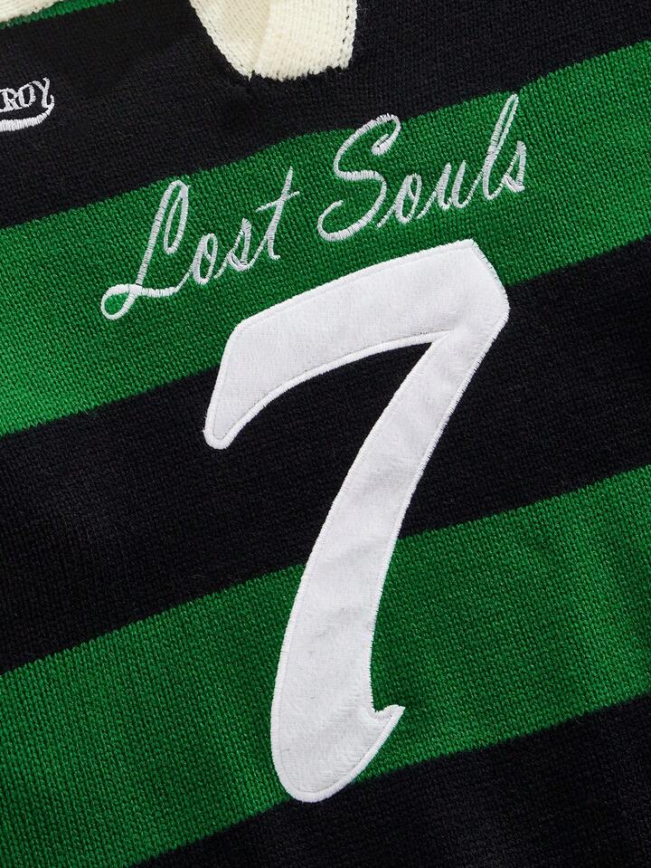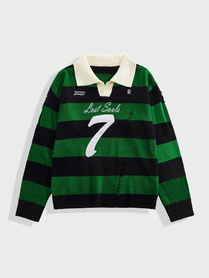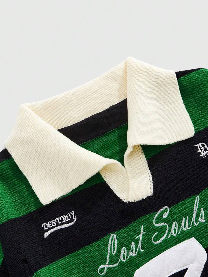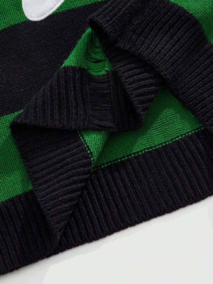 Street Life Suéter de manga larga con rayas bordadas para hombre, corte holgado y acortado
