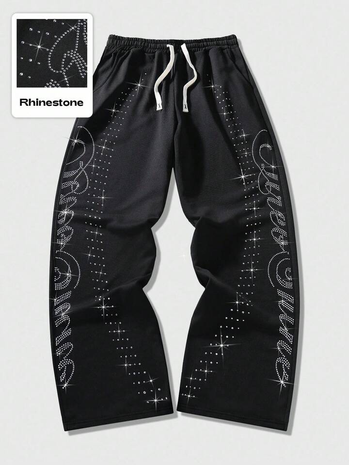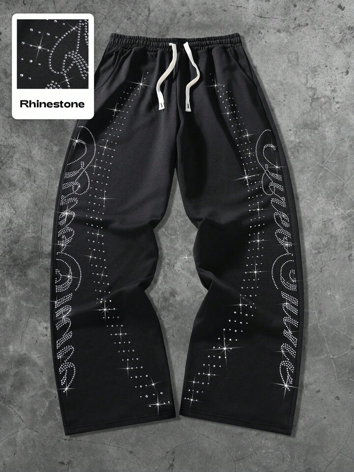 Street Life Pantalones de chándal rectos con adornos de strass con estilo callejero estadounidense para hombres
