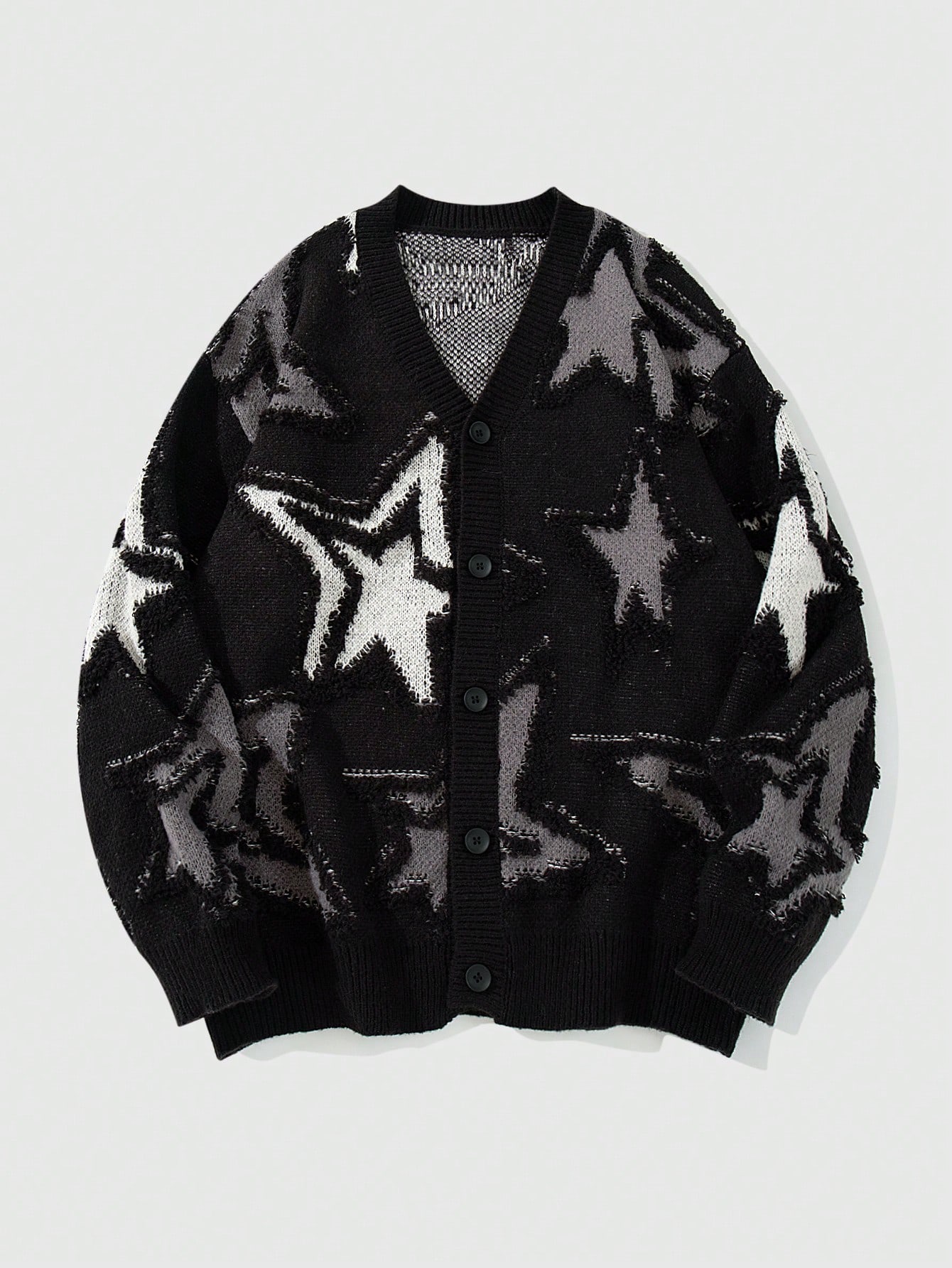 Street Life Cárdigan de punto con cuello en V y botones con estampado de estrella de cinco puntas de moda para hombre