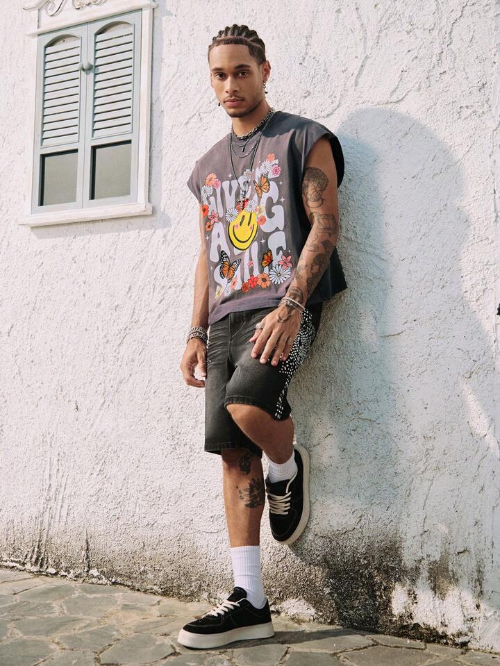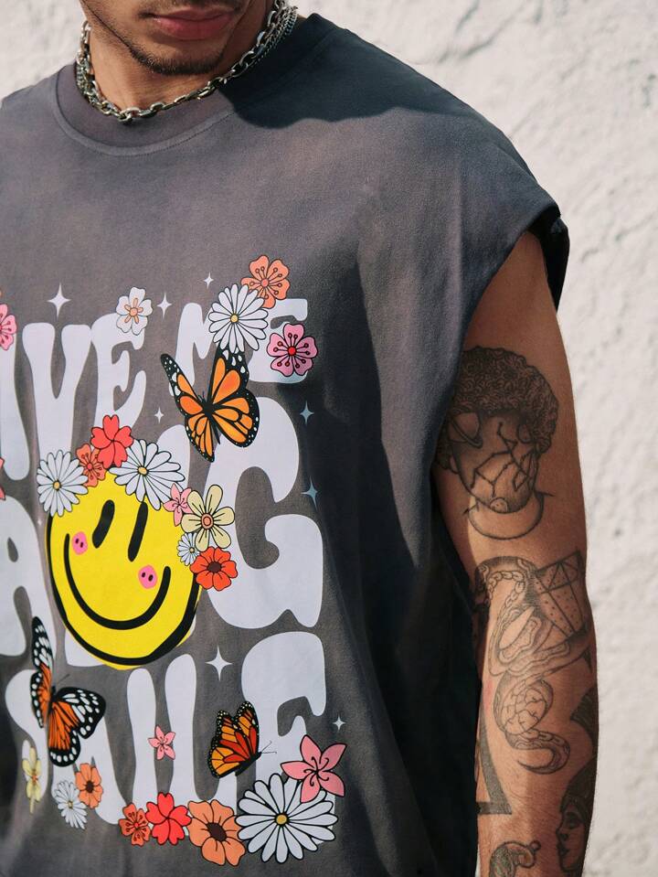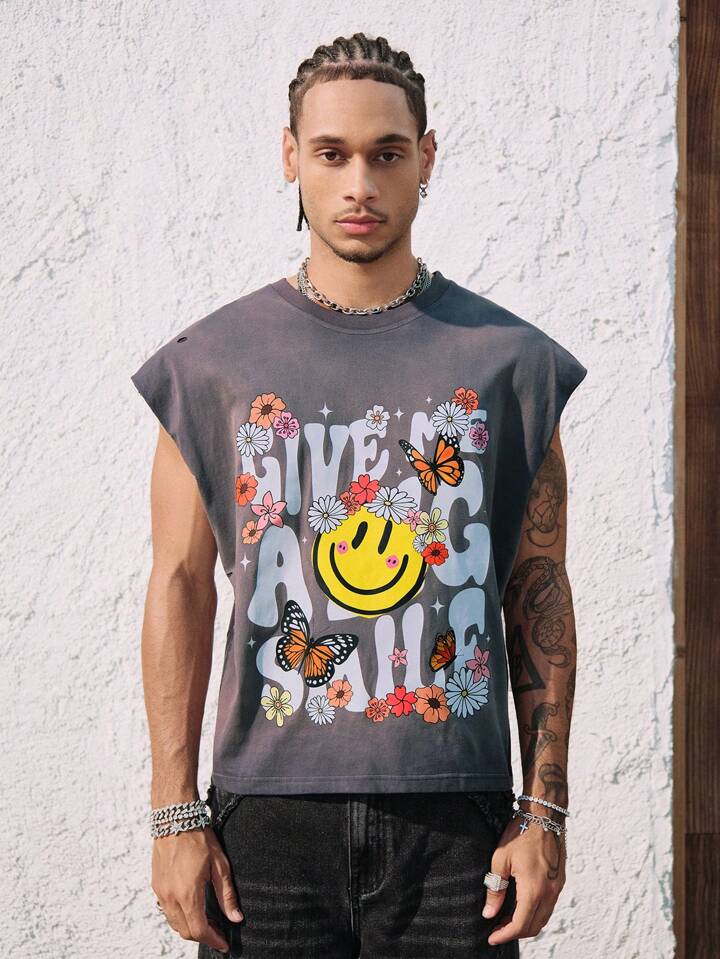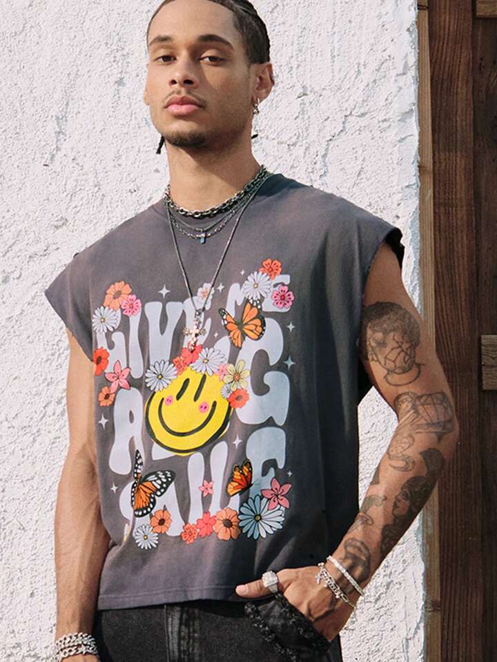 Street Life Top de tirantes con cuello redondo con estampado de margaritas y letras desgastado y rasgado para hombre