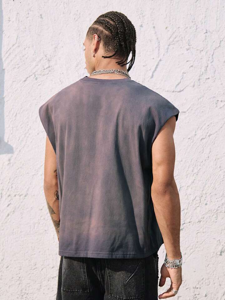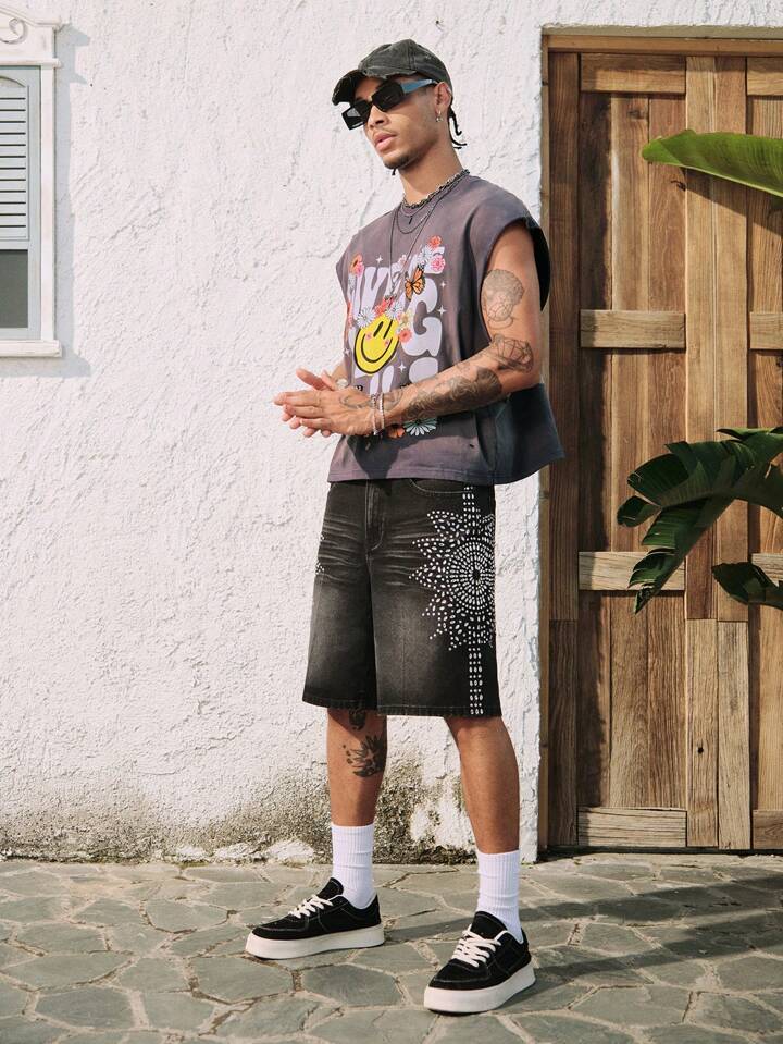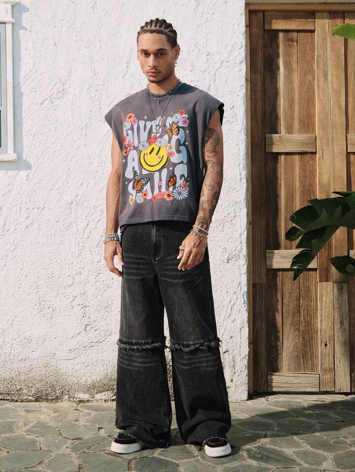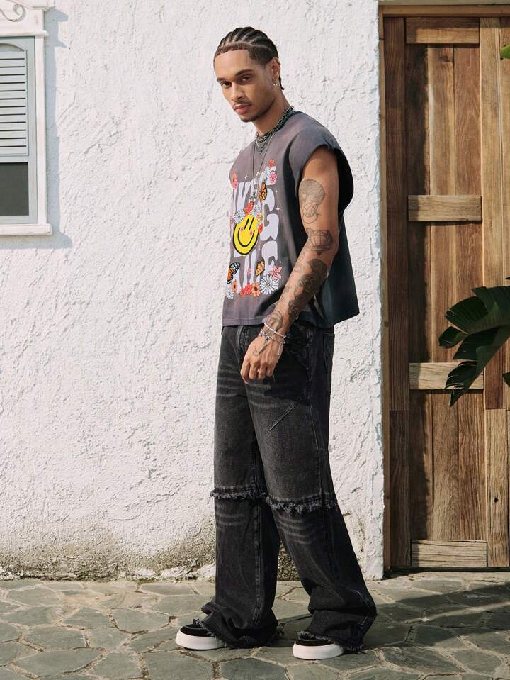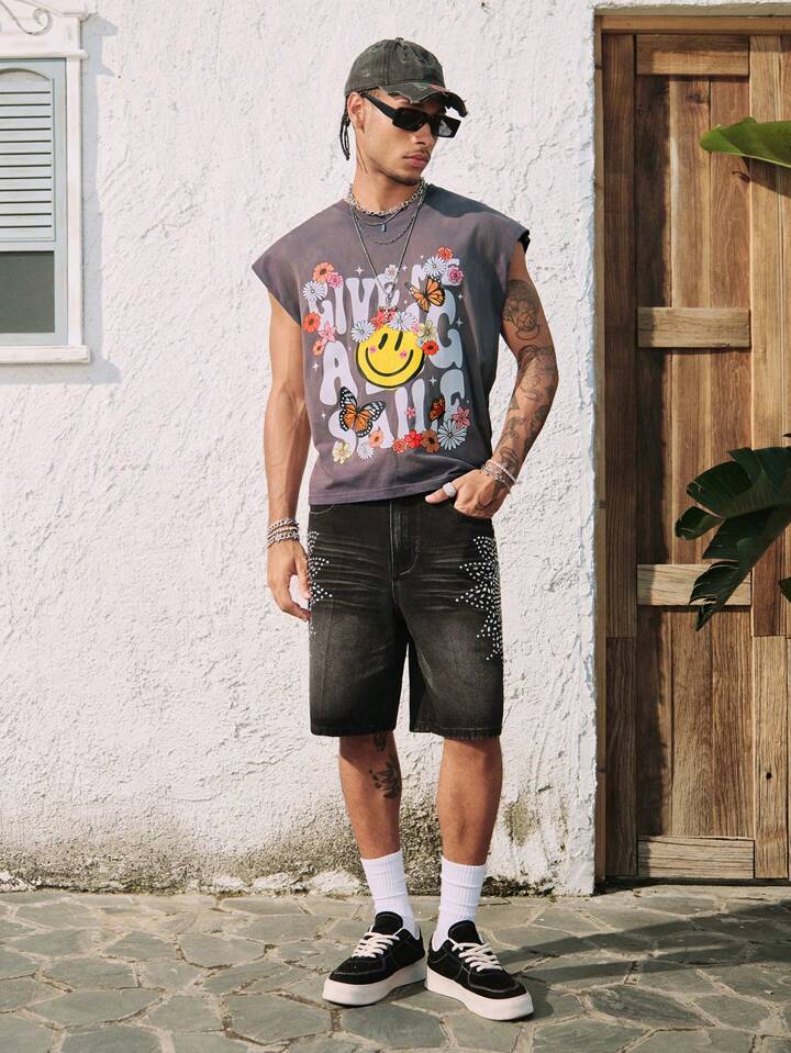 Street Life Top de tirantes con cuello redondo con estampado de margaritas y letras desgastado y rasgado para hombre