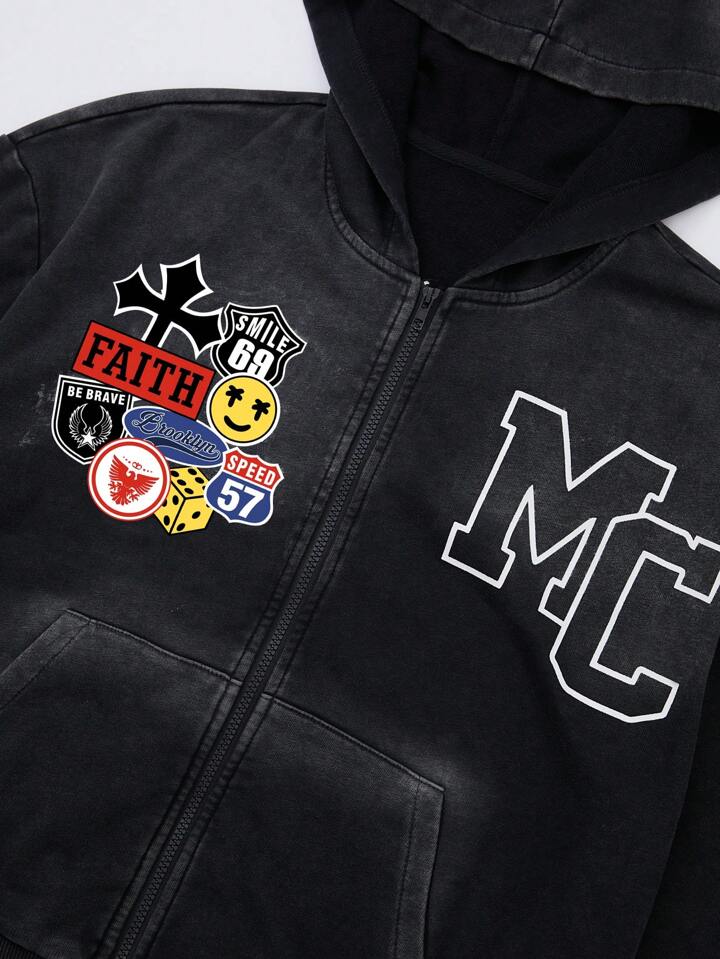 Street Life Sudadera con capucha y cremallera lavada para hombre con bolsillos y detalles en forma de letras aplicadas, de manga larga