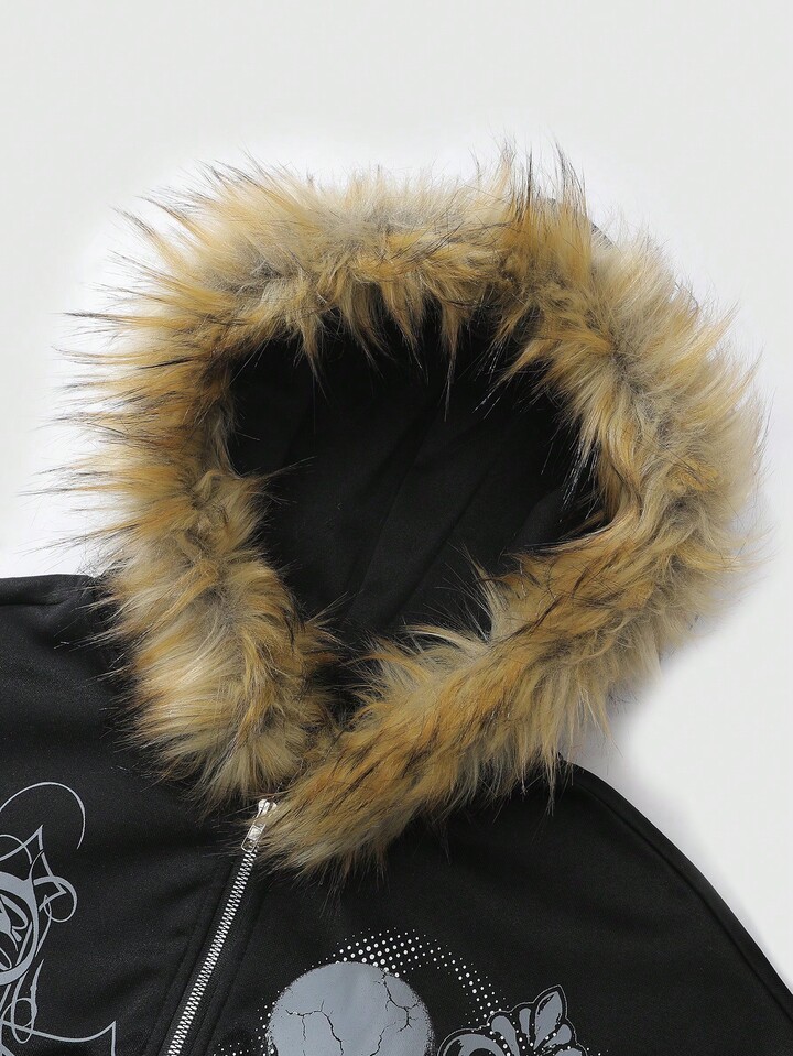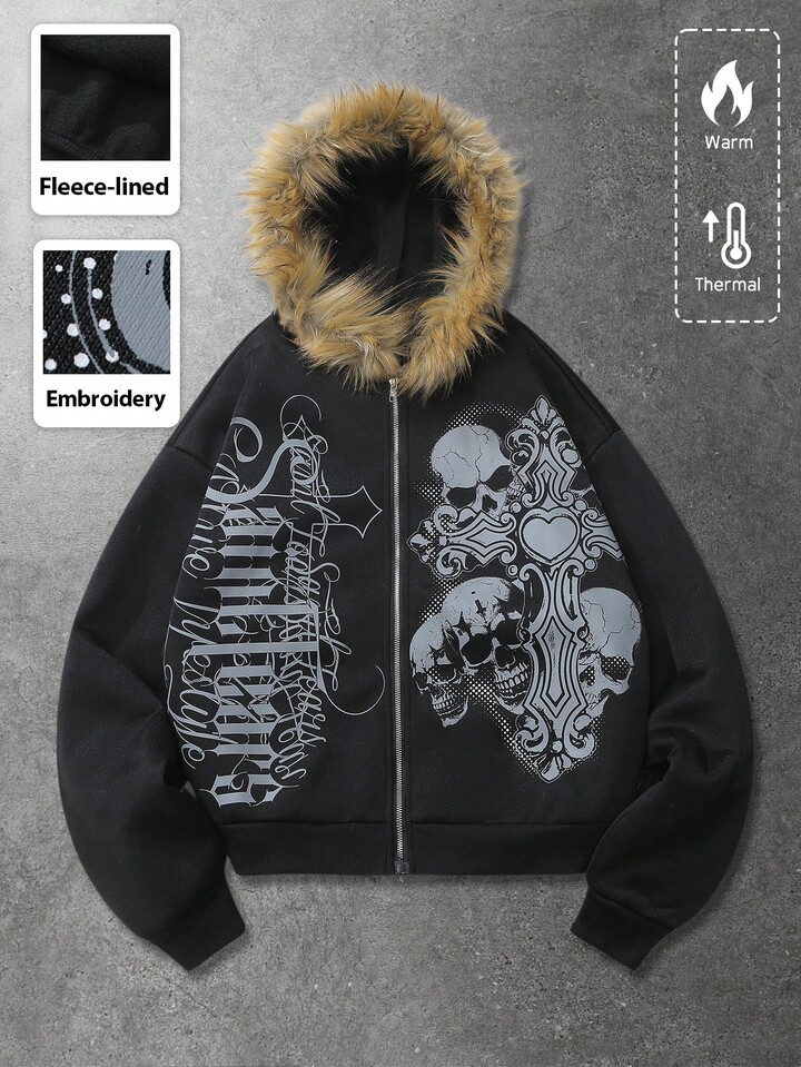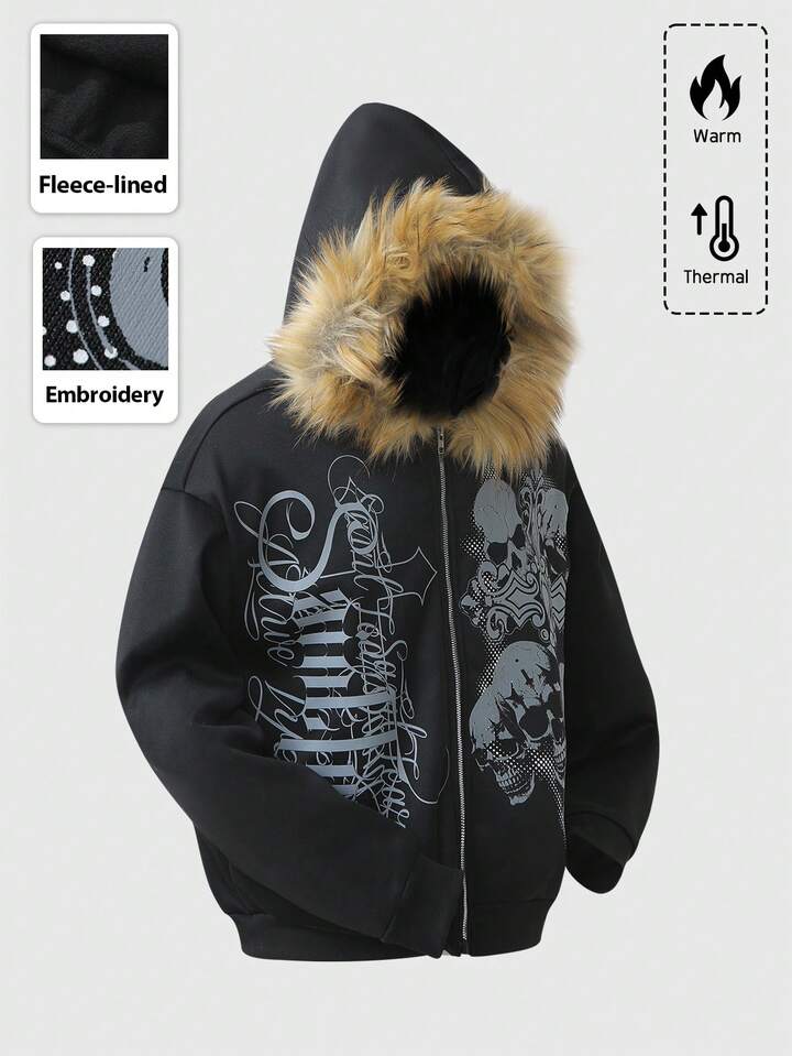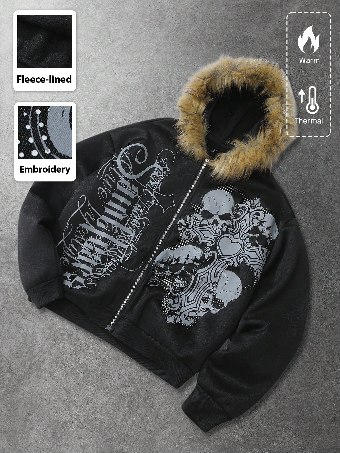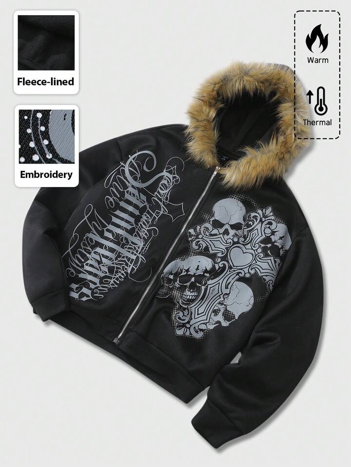 Street Life Sudadera con capucha forrada térmica con estampado de calavera, uso casual de todos los días, otoño/invierno