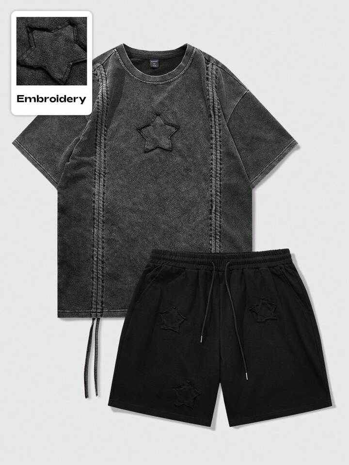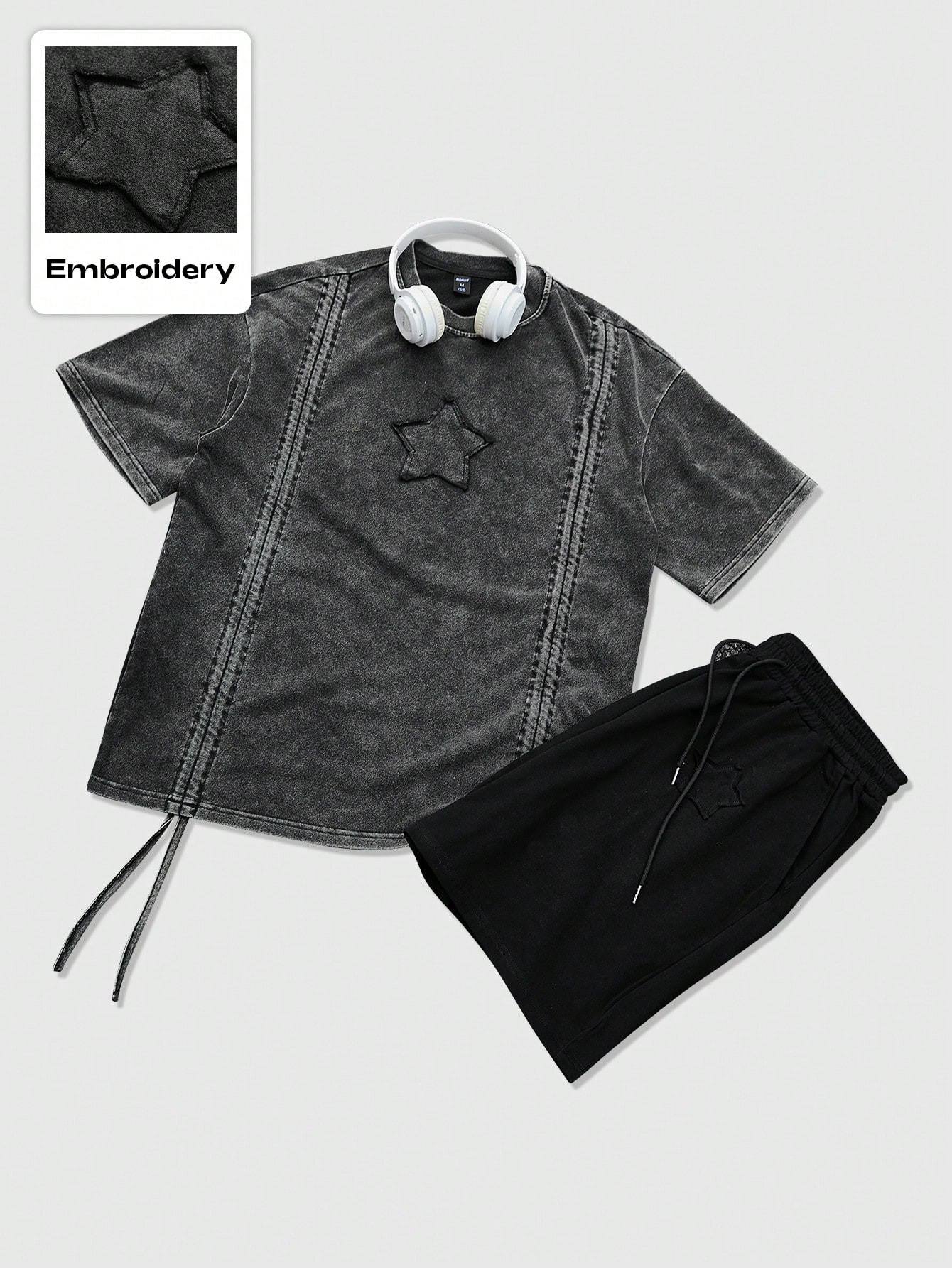 Street Life Camiseta de manga corta negra con aspecto vintage desgastado, parche bordado con estrella de cinco puntas de estilo estadounidense, ajuste holgado casual con cordón, camiseta urbana