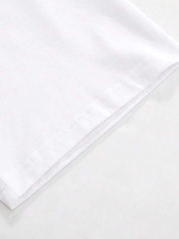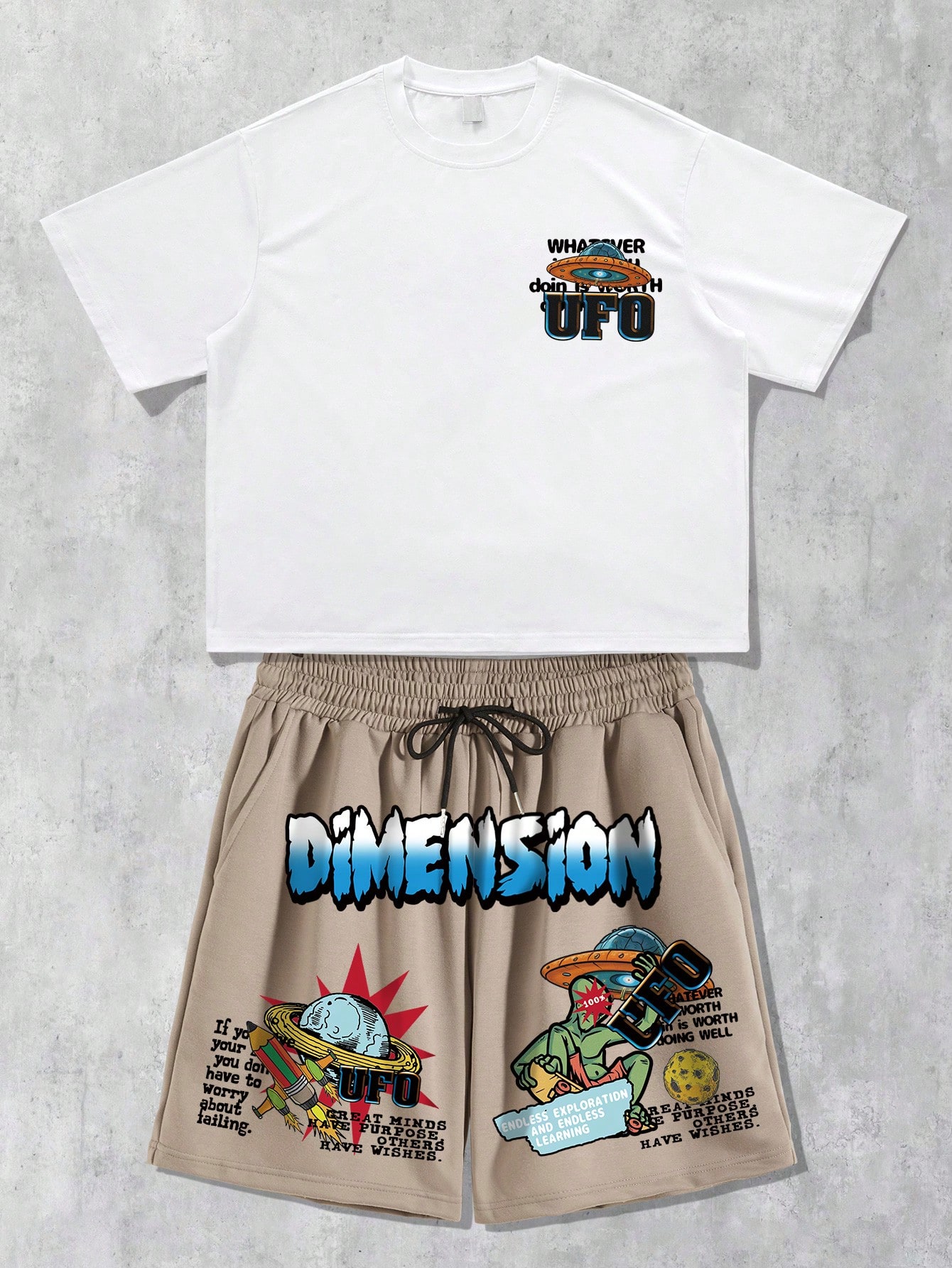 Street Life Conjunto casual de 2 piezas para hombre: Camiseta blanca y shorts beige. La camiseta y los shorts cuentan con diseños gráficos llamativos que incluyen texto y ilustraciones en colores audaces. Los shorts beige son sueltos y cómodos. El estilo general es casual pero elegante, adecuado para entornos urbanos modernos.