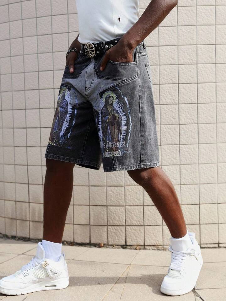 Street Life Pantalones cortos vaqueros casuales con bolsillos y estampado gráfico para hombres de verano
