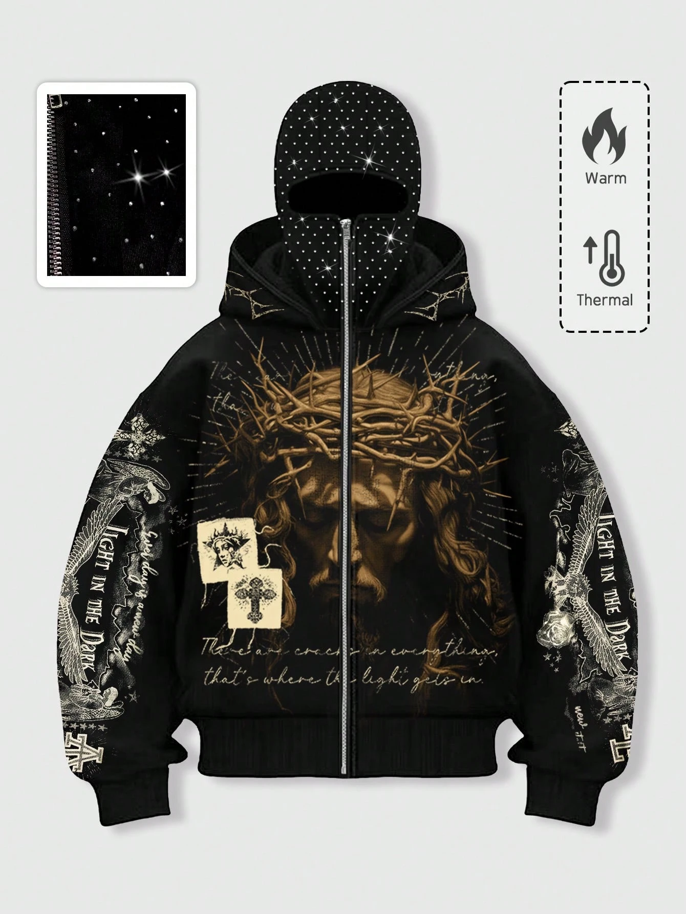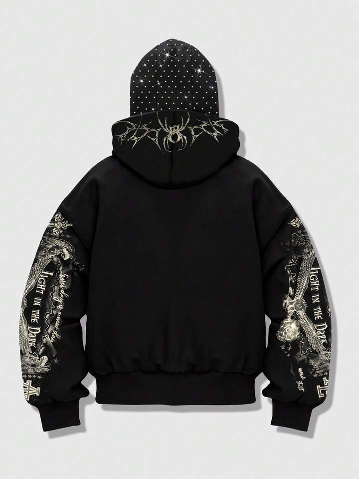 Street Life Sudadera con capucha oscura y cremallera con adorno de strass para hombres, otoño