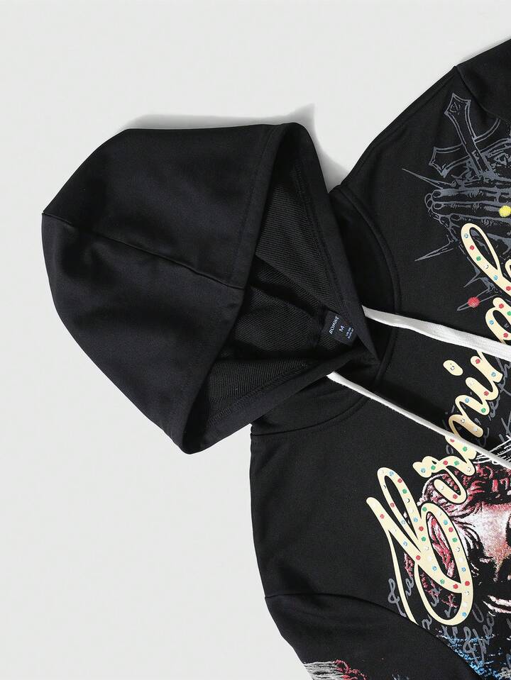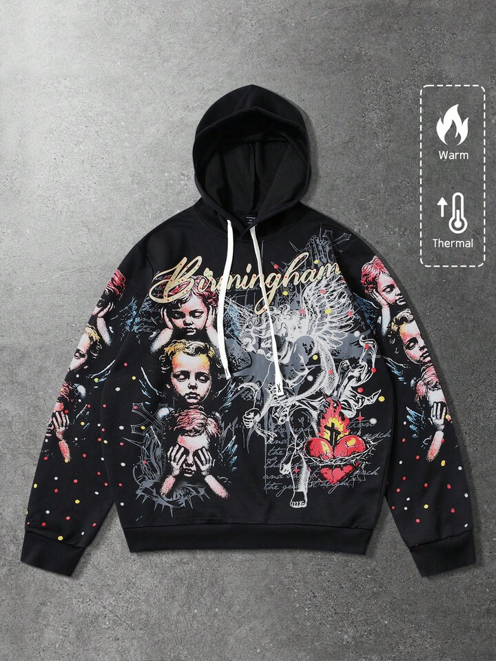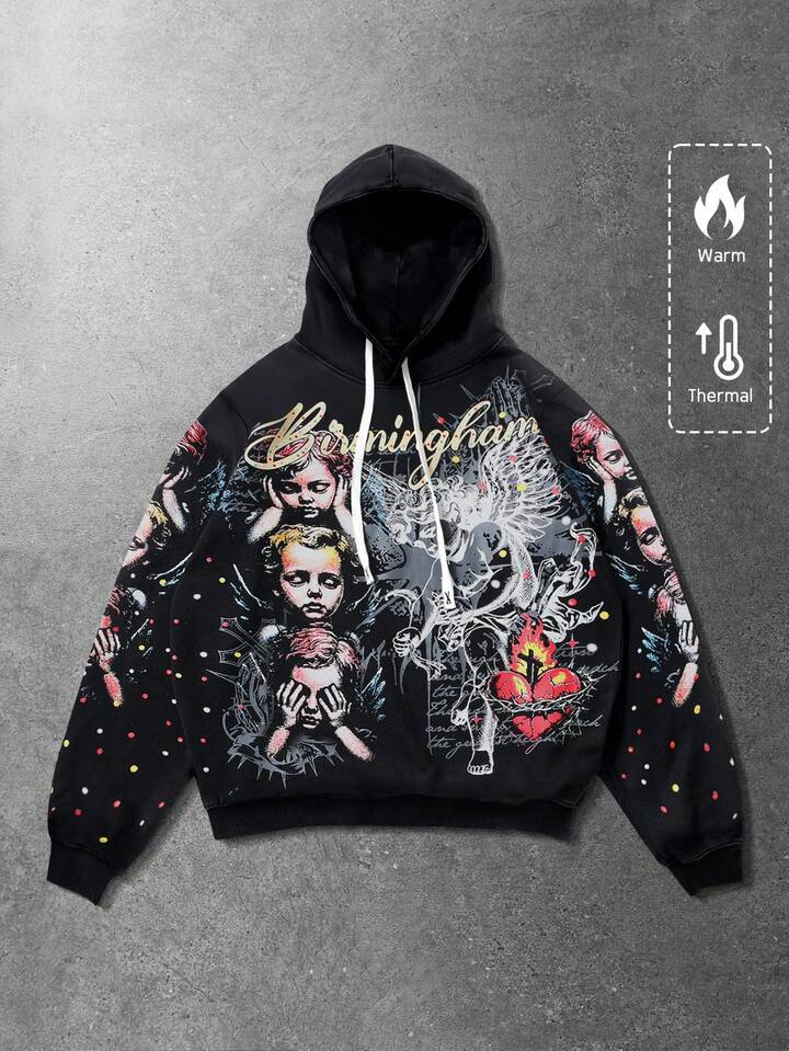 Street Life Sudadera con capucha unisex con estampado gráfico en inglés de ángel infantil, estilo callejero americano, de manga corta, para otoño/invierno